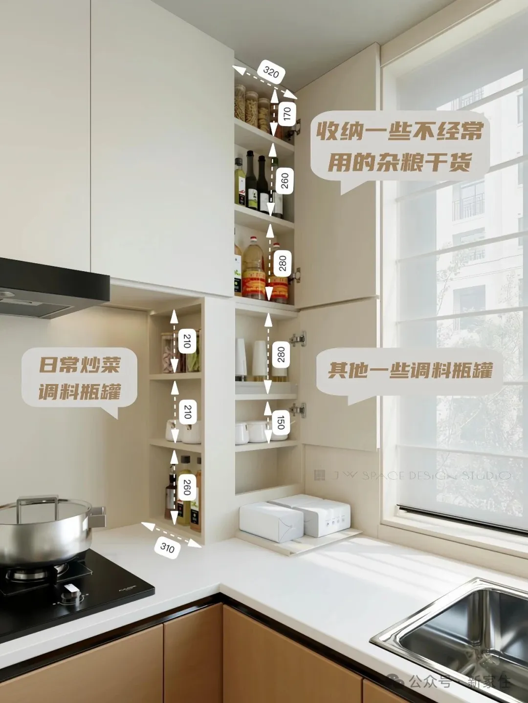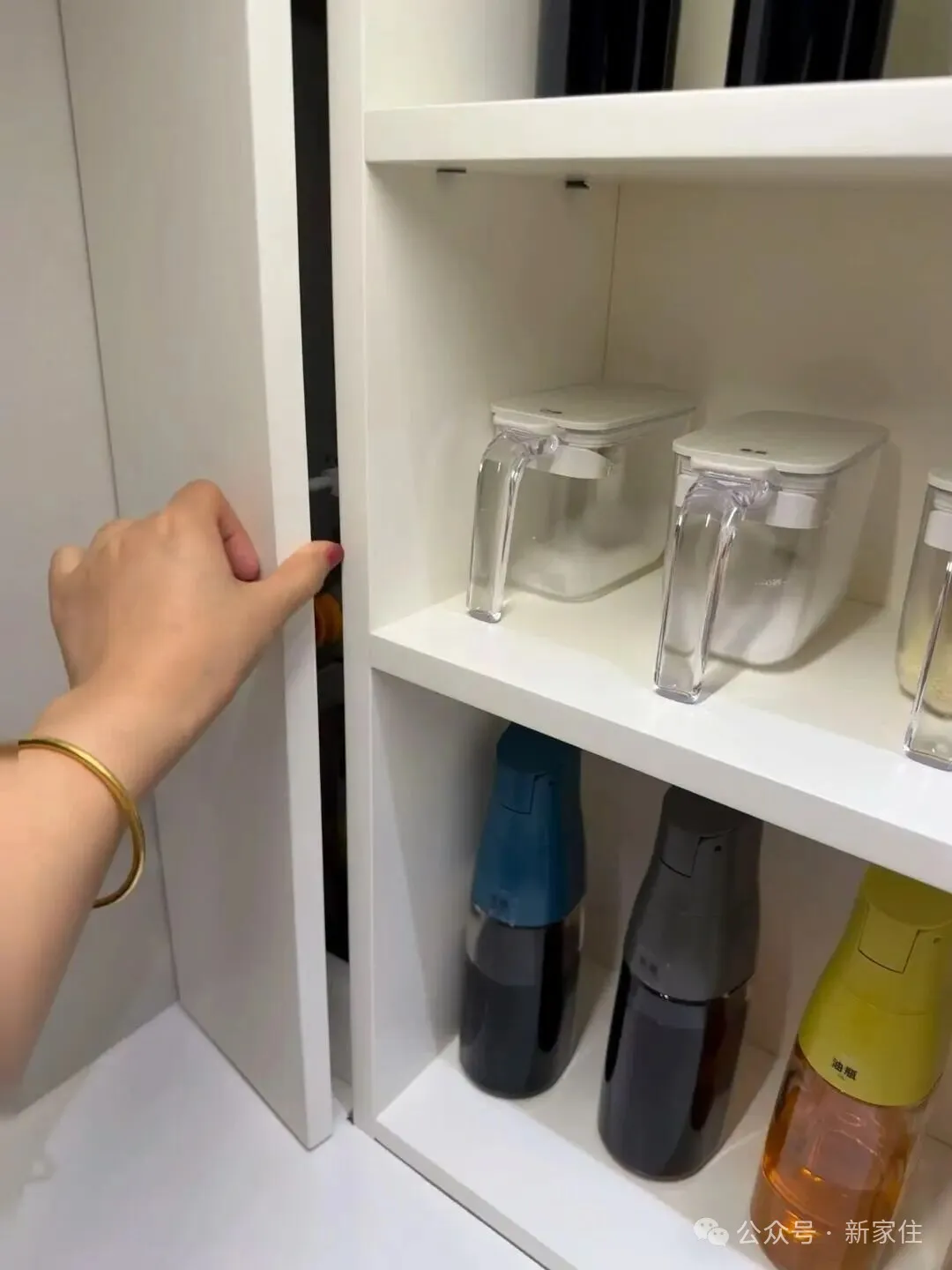这个调料柜子虽然很薄,但是却很装,用于放厨房的调料和瓶瓶罐罐,调料柜正好在炉灶的旁边,炒菜时打开门一目了然,而且柜门一关,清清爽爽整洁利索!