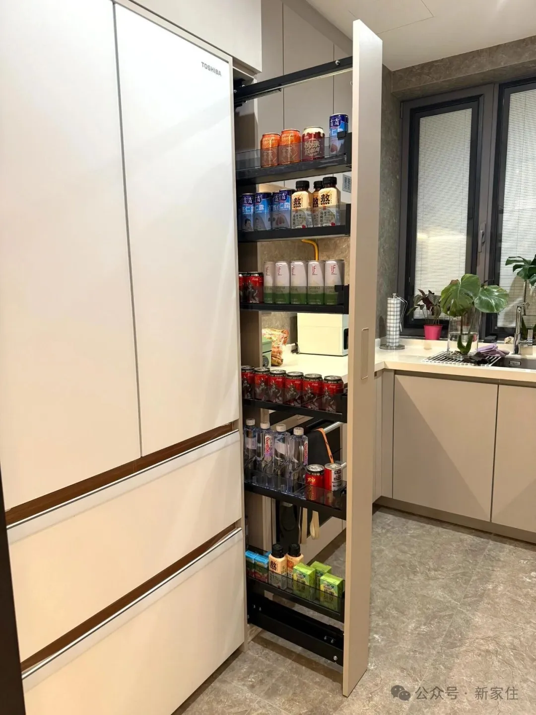 不要小瞧这个十几公分的缝隙,我家做了个抽拉柜,可以放置零食、饮料等,用的时候,拉出来,拿取方便。用完推回去,整个柜面干净整洁!