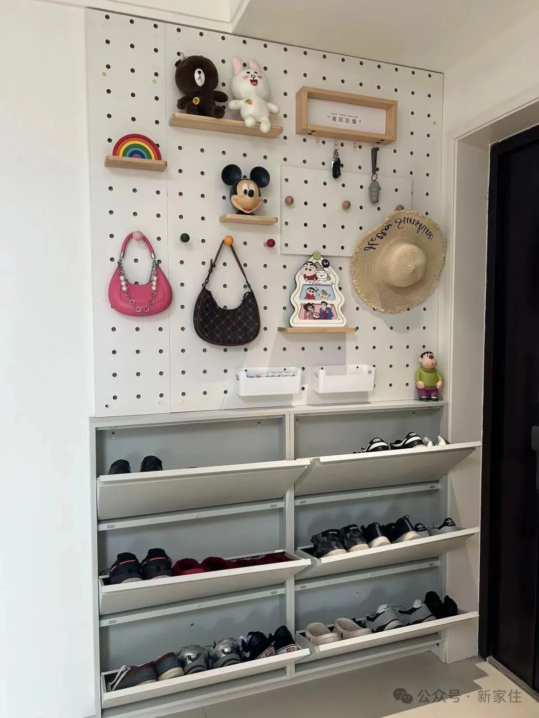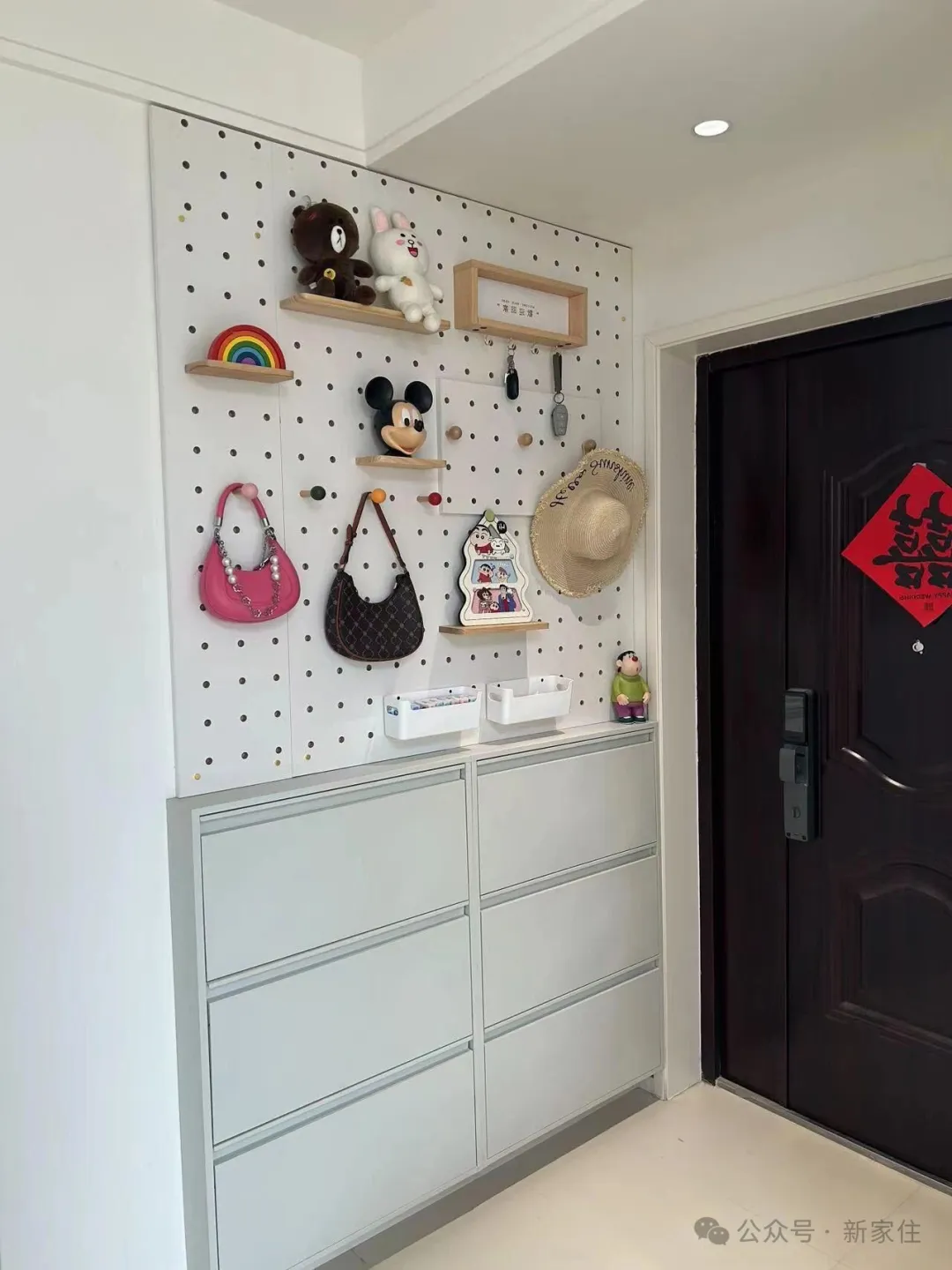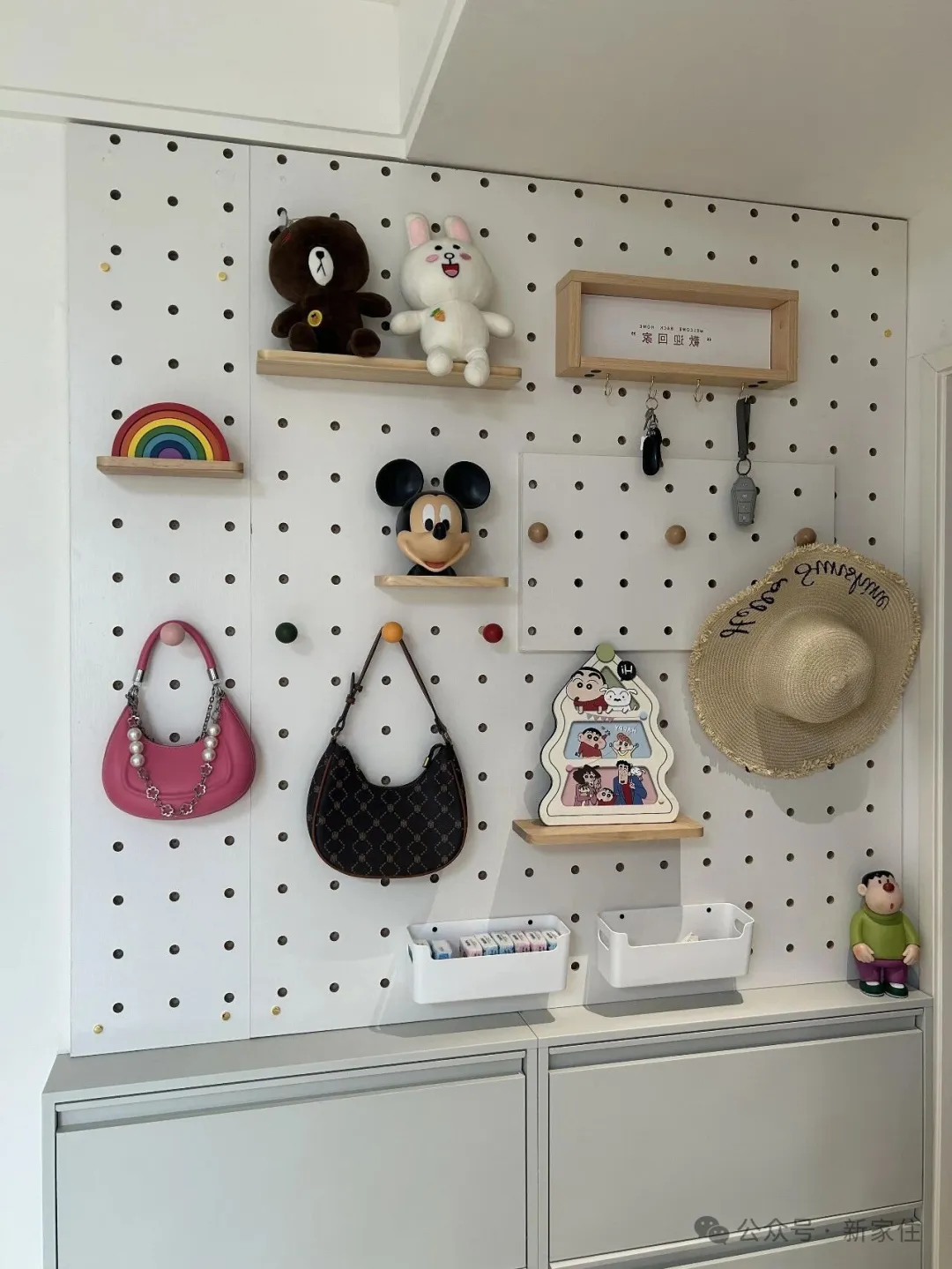 别看他薄,内部设计合理,轻松实现大容量收纳!并且搭配洞洞板,各种挂钩、置物架随心搭配,帽子、包包、钥匙、雨伞等,想挂就挂,拿取方便。还能根据自己的心情随意布局。