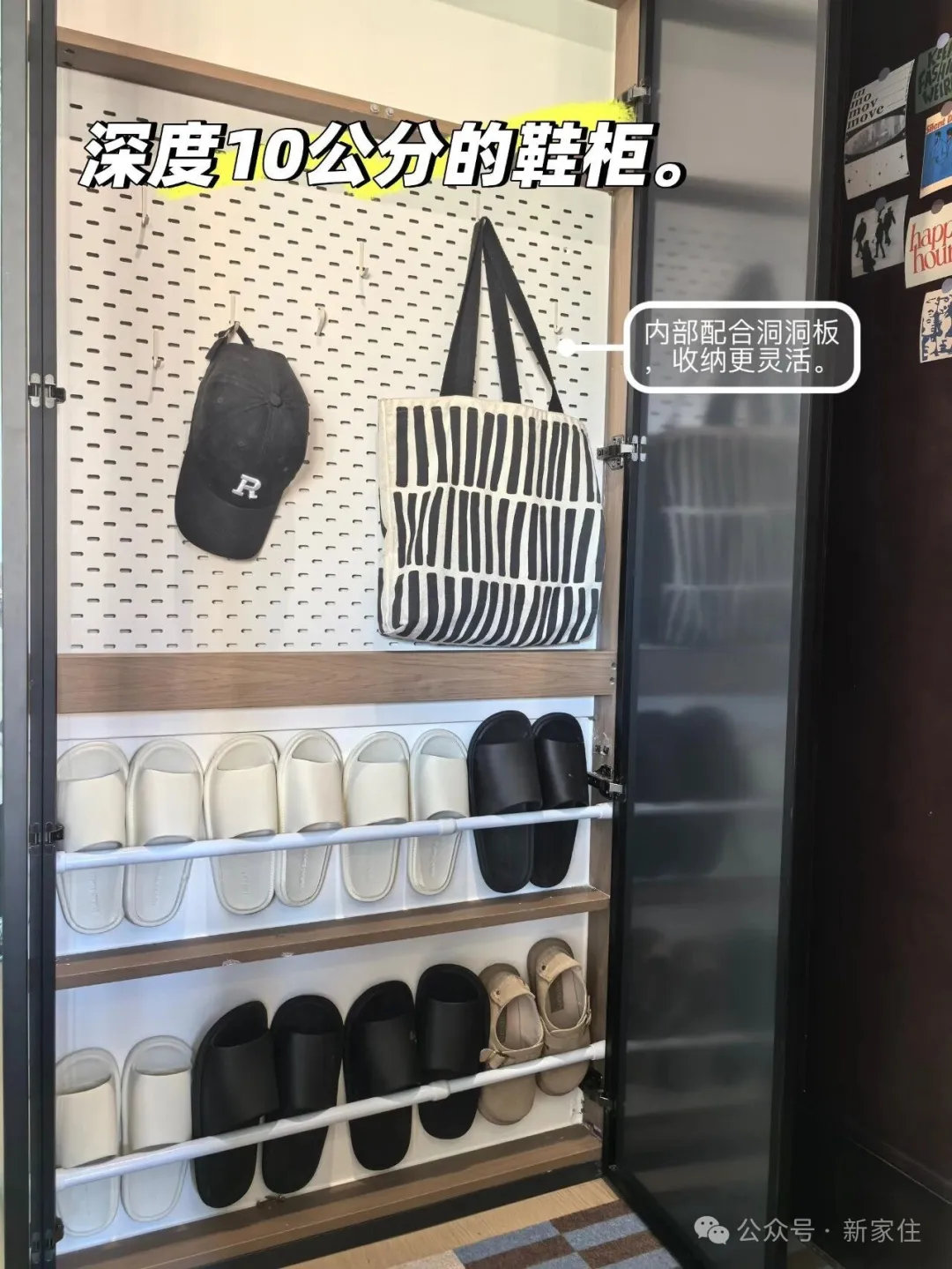 ①做超薄侧翻鞋柜入户空间小,咱就做个翻斗鞋柜。鞋子斜插放进去,比如这个鞋柜只有12cm,可以完美适合小户型。