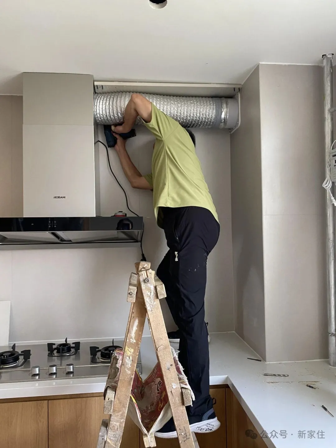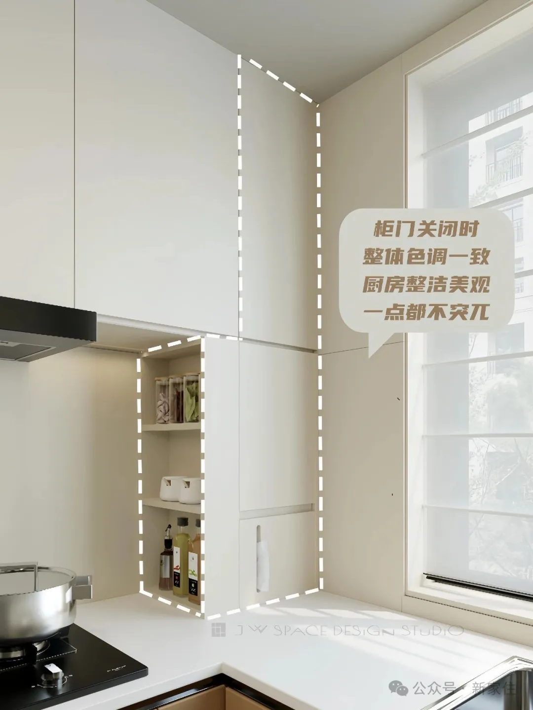 几乎每家都会有烟道,这个看上去又蠢又浪费空间的柱子,还没办法拆掉。于是我把它变成一个调料柜。顺便把燃气管道隐藏好,留个小门做饭,方便开关燃气。