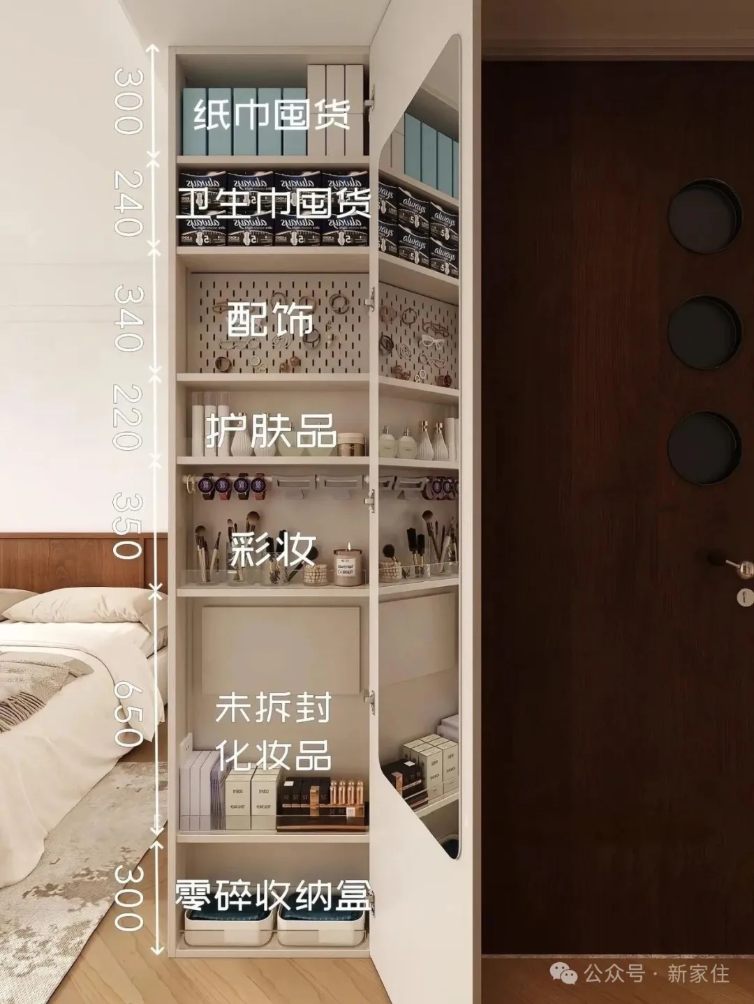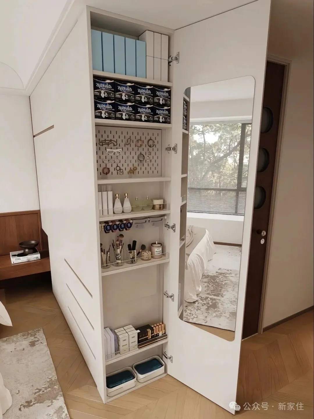 这个薄柜,功能可多了,可以放化妆品、护肤品、卫生纸等,再搭配一个化妆镜,妥妥的一个超薄化妆柜,有了这个空间,还要什么梳妆台!