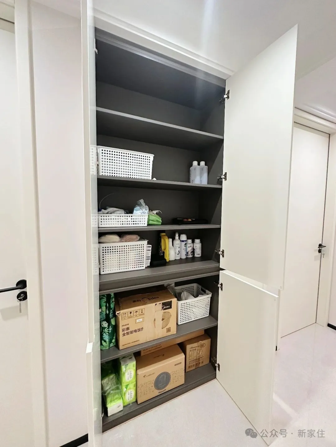 当然了,也可以在走廊的侧面做柜子,当一个简易的800库。放置一些杂物和收纳箱,真的很方便。尤其是挨着卧室和卫生间,非常顺手!