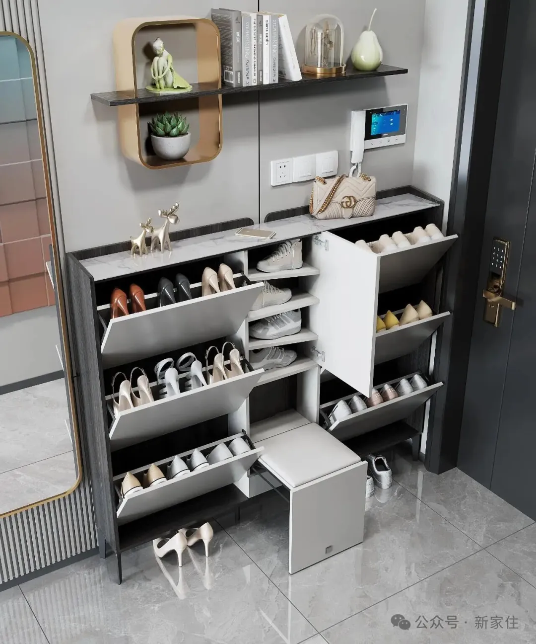 另外,可以再增加一个折叠换鞋凳,这样在换鞋子的时候,不用尬尴的半蹲了,尤其是腰不好、老人、孕妇、小孩子,隐藏式的换鞋凳,真的是很实用,折叠起来完全不占地方!