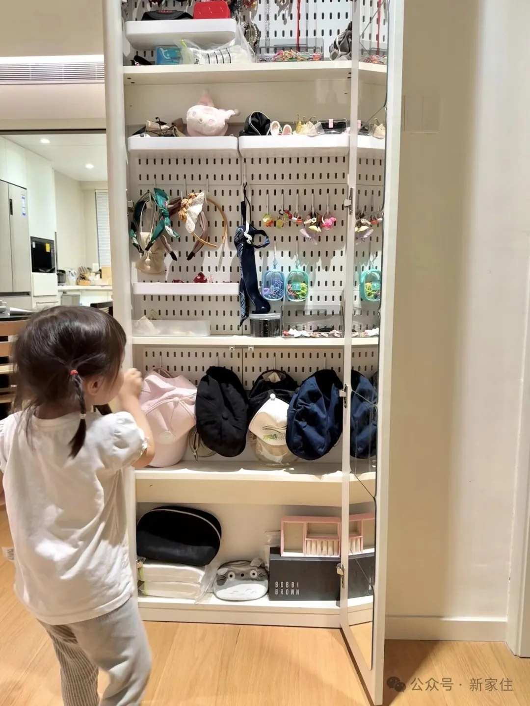 如果想要节约空间,柜子可以不做背板,改用洞洞板。很多人质疑这么薄的柜子能放啥,其实能放的东西很多,尤其适合女生,化妆品、饰品、洗护用品,还有小女孩的头绳发饰,挂起来一目了然而且很好拿取!超级实用!