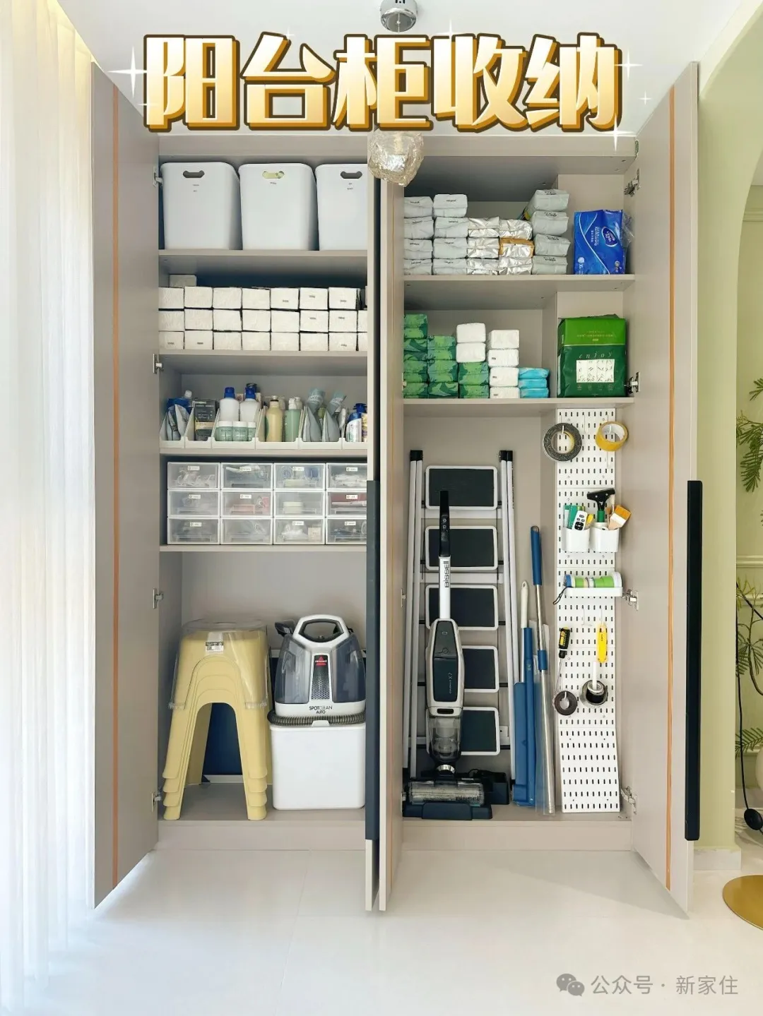 阳台一侧做薄柜,高度约2.5m,宽1.3m,收纳柜内部预留了插座,方便给扫地机器人等电器充电,柜内左侧做储物格,放置收纳盒、五金等,右侧柜,上面收纳不常用的东西,下面做洞洞板,挂置吸尘器、折叠衣杆等,考虑到拿取物品的方便性,柜门都用了165°铰链。一个阳台薄柜,收纳了家里大部分的工具,真是个实用的家政柜。