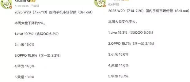 中国手机圈又洗牌了!苹果跌出前五,小米掉队,vivo“遥遥领先”上了实锤! 你很难想象,2025年国产手机这场排位赛,居然会演成**“蓝厂VS全世界”**。 W29全国销量数据显示: 👉 第1名:vivo(19.3%) 👉 第2名:OPPO(15.7%) 👉 第3名:小米(15.6%) 👉 第4名:荣耀(14.6%) 👉 第5名:华为(13.7%) 👉 第6名:苹果(12.2%) 这波vivo是真的硬吃“遥遥领先”四个字——连续第6周霸榜第一名,iQOO系列作为副牌,还能分走整整6%的市场份额。 而曾经叱咤高端、冲击旗舰的小米、荣耀、华为,却在榜单中各种你追我赶,不进反退。 最令人“破防”的是:苹果,居然排了第六,连华为旗舰都打不过!! OPPO靠Reno14疯狂收割市场,华为Pura80直接降价800都没拉票,小米8月没新机只能等红米撑场子。 这种局面,真的很像当年国产新能源车围殴特斯拉,只不过这次被围殴的,是苹果。 📢评论区炸了: “遥遥领先不是口头禅,是vivo的KPI。” “苹果跌出Top5这事,放两年前你敢想?” “感觉vivo把别人当对手,别人却拿vivo当参考线。”