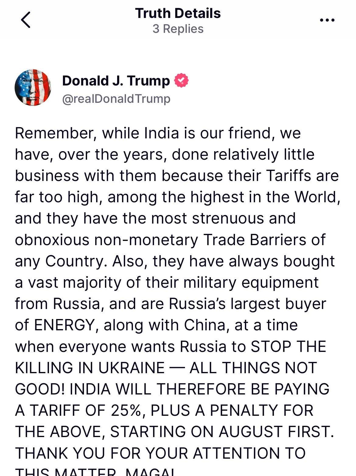 7月30日晚上,特朗最终发布了对印度的对等关税——25%。这个数字可以说远远超出