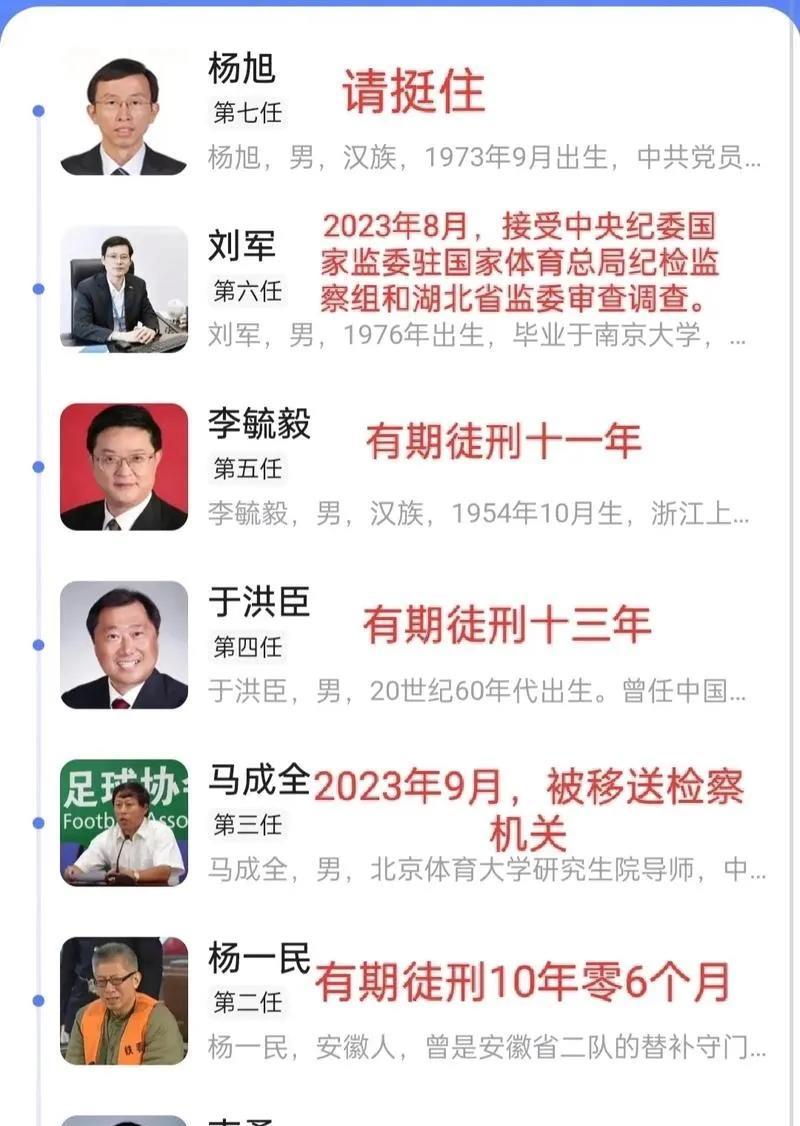 世界上最高危的职业不是韩国总统,而是中超公司的董事长。 中超公司六任董事长,无一例外,皆获刑,没有一个安全落地。 南勇,受贿罪,刑期10年6个月,罚金20万元。 杨一民,受贿罪,刑期10年6个月,罚金20万元。 于洪臣,受贿罪,刑期13年,罚金200万元。 马成全,受贿罪,刑期11年3个月,罚金80万元。 李毓毅,受贿罪,刑期11年,罚金100万元。 刘军,受贿罪,刑期11年,罚金110万元。 中国足球已经烂到根了,再不推倒重来,中国足球就会成为全世界的笑话,而且给大国形象抹黑。