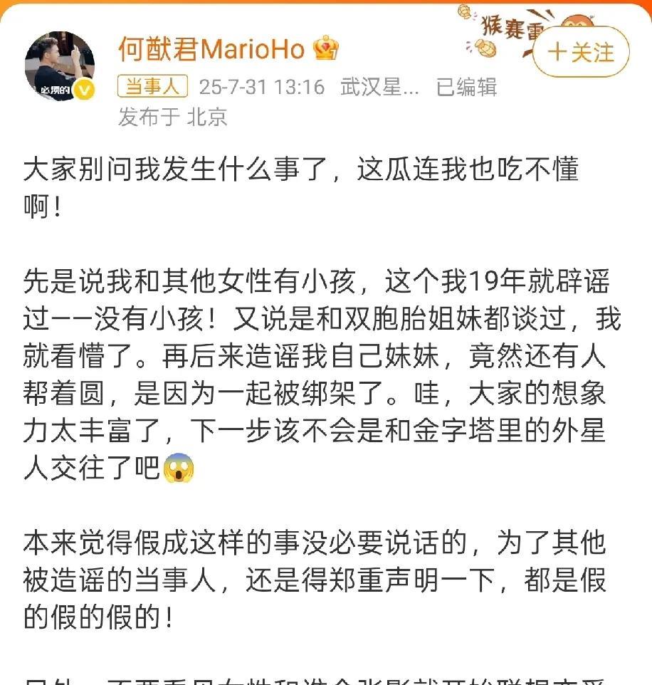 7月31日,网上有人爆料说何猷君和自己的亲妹妹乱伦,还晒出了俩人一起睡觉的床照,直接点燃了热搜,对此何猷君也火速发文辟谣,称网友们的想象力太丰富了,居然能造谣到他和自己的妹妹身上,这一切都是假的,请大家不要胡乱造谣传谣。 何猷君都被造谣和亲妹妹乱伦了,还能理智不带脏字的发声明辟谣,这修养脾气是真好,当然也可能是被这离谱的谣言气笑了,觉得假成这样,自己没必要那么愤怒。 说实话之前网上造谣何猷君私生活混乱这种瓜就算了,起码还之前感情上的事情,但这次直接造谣何猷君和亲妹妹谈恋爱,这就涉及到道德伦理方面了,感觉能编造出这种谣言的,一定是骨科小说看多了,看到个豪门兄妹关系好的,就扭曲人家的亲情。 至于何猷君和妹妹的床照,就是很普通的何超欣睡着了,何猷君歪着头和妹妹合影的照片,就很正常,并没有什么暧昧的气氛。#头号创作者激励计划#