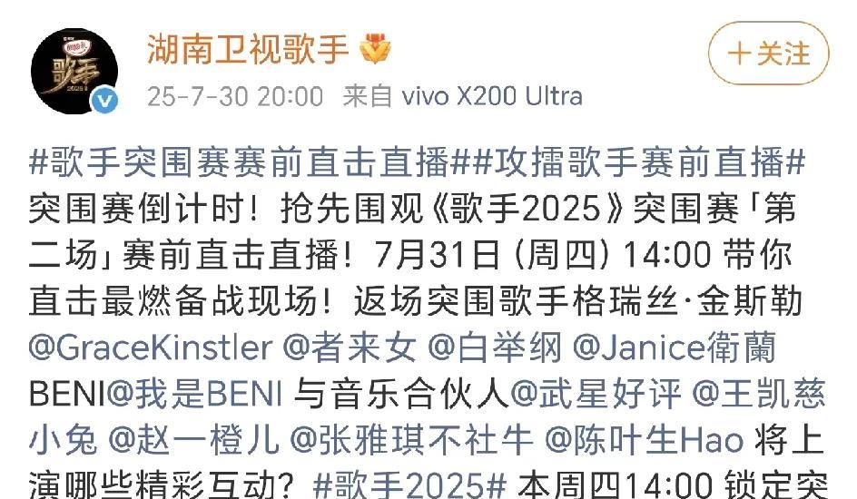 《歌手2025》突围赛,只有五位歌手返场来冲榜,唯一变数是格瑞斯! 从突围赛就能看出来,歌手们有多难请,不但请不来好歌手,就连来过的都不想再返场了,最后只有者来女,Beni这样的边缘歌手来凑合个局,就连范玮琪都勇敢的说不!歌手下一届恐怕要更难了! 突围赛四位守擂歌手,谁最弱? 非常不情愿的但是也得面对事实说话,是林志炫!曾经的情歌唱将廉颇老矣,那些经典的歌声只能留在回忆里了,但是今年又很神奇的有一个众所周知的秘密,那就是林志炫必进总决赛! 如果总决赛里只有陈楚生一个男歌手,都不知道节目组要咋进行下去了,太尴尬了! 所以这场突围赛唯一变数就是格瑞斯了,她要挑战谁才有机会进入总决赛? 很显然,只有艾丽西亚! 没想到最后一场突围赛看的竟然是两个国际歌手的对打,还真是歌手倡导的国际赛来了! 其实我倒很希望白举纲能重回在线行列,给新生力量一点机会吧!#歌手2025#