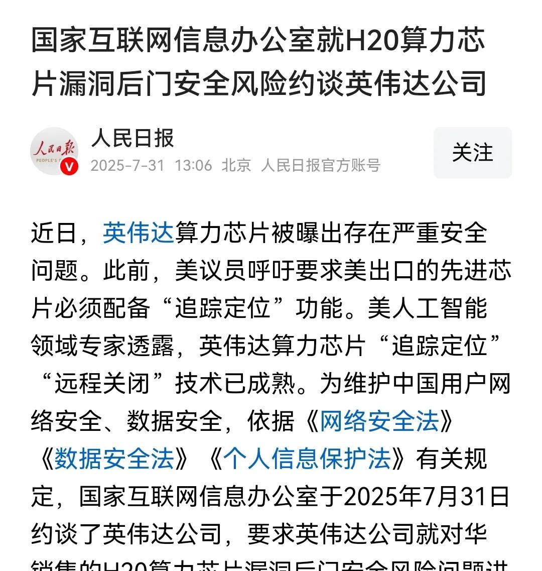 英伟达H20芯片在华悬了! 国家网信办针对H20人工智能芯片漏洞安全风险正式约谈英伟达公司,黄仁勋要完蛋了! 国家网信办正式出手约谈英伟达,这是在掌握证据的基础上进行的,说明H20人工智能芯片对华销售目的非常龌龊,英伟达在对华特供H20芯片里面植入后门,被曝光可以远程关闭。美国政府还奢望拿这个来换中国稀土,简直是无耻之极! 这次,相信中方已经掌握了足够的证据,英伟达想抵赖都没机会了,必须严惩不贷。同时对美国政府的肮脏龌龊的行径必须给予严重的警告和惩戒! #头号创作者激励计划#