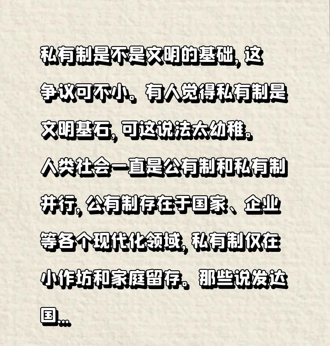 私有制是不是文明的基础,这争议可不小。有人觉得私有制是文明基石,可这说法太幼稚。人类社会一直是公有制和私有制并行,公有制存在于国家、企业等各个现代化领域,私有制仅在小作坊和家庭留存。 那些说发达国家都是私有制的,也不符合事实。现代化大科技公司产权并非个人私有,像乔布斯、马斯克的企业发展都离不开集体。股份制公司这种现代管理模式,让公司姓公不姓私。所以,私有制很难说是文明唯一基础。