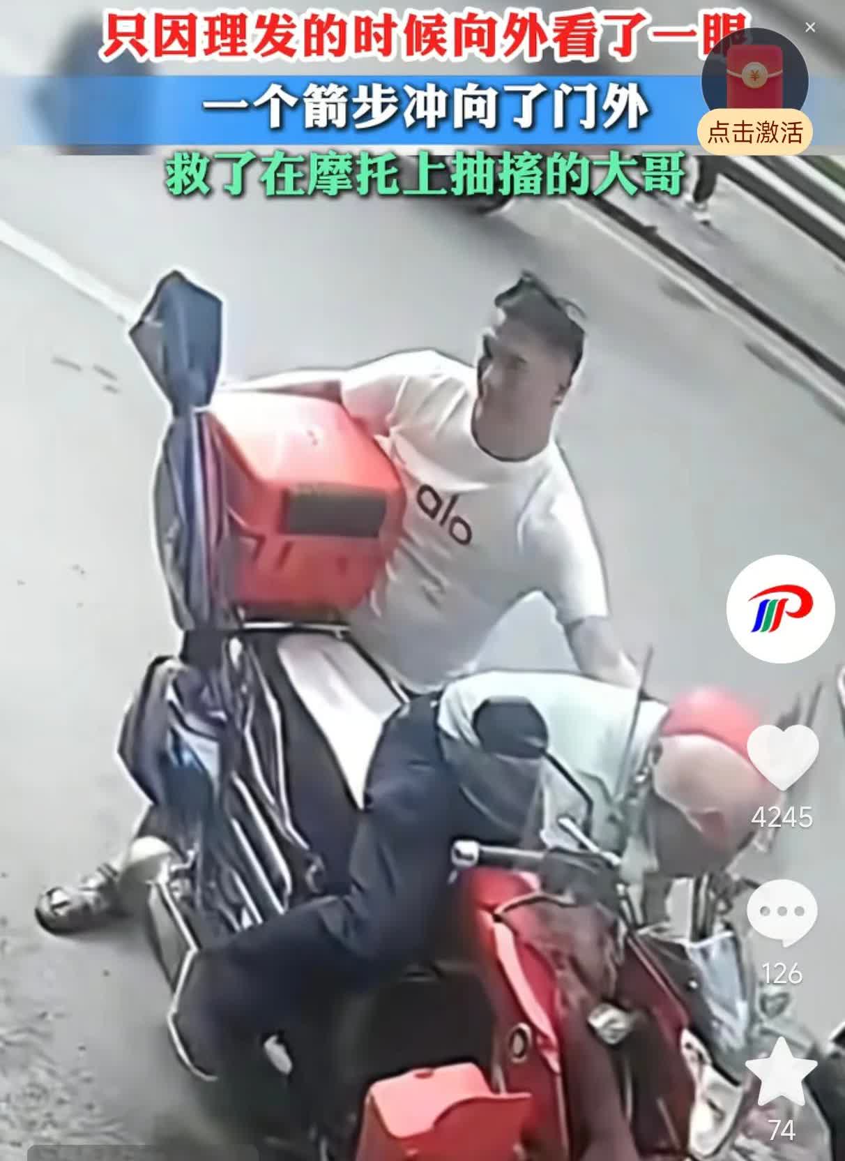 活该他发财!四川,一理发店老板正在给顾客理发,抬眼的一瞬间看见店外摩托车上的男子连人带车将要摔倒,立刻飞奔出去一把扶住摩托车,此刻男子还在不停地抽搐,随后老板立即拔打急救电话,十分钟后男子获救。 老板正在给一位顾客理发,抬头朝店外瞅了一眼,看见一名男子骑摩托车停在店外,以为是来理发的,正准备迎接,却不见男子下车。 男子身体逐渐朝一侧倾斜,还不停的停地抽搐,眼看连人带车就要摔倒,老板一个箭步迅速冲向了门外,一把扶起摩托车,而男子趴在摩托车上抽搐。 周围的邻居见状也赶来帮忙,和老板一起扶稳摩托车,随后老板立即打急救电话,十分钟后男子被救护车带走。 有网友说帅气的老板眼手准快,好人有好报,必定生意兴隆。 也有网友说老板这一扶救的不仅是一个人,更是一个家庭,这是有福之人遇到了贵人。