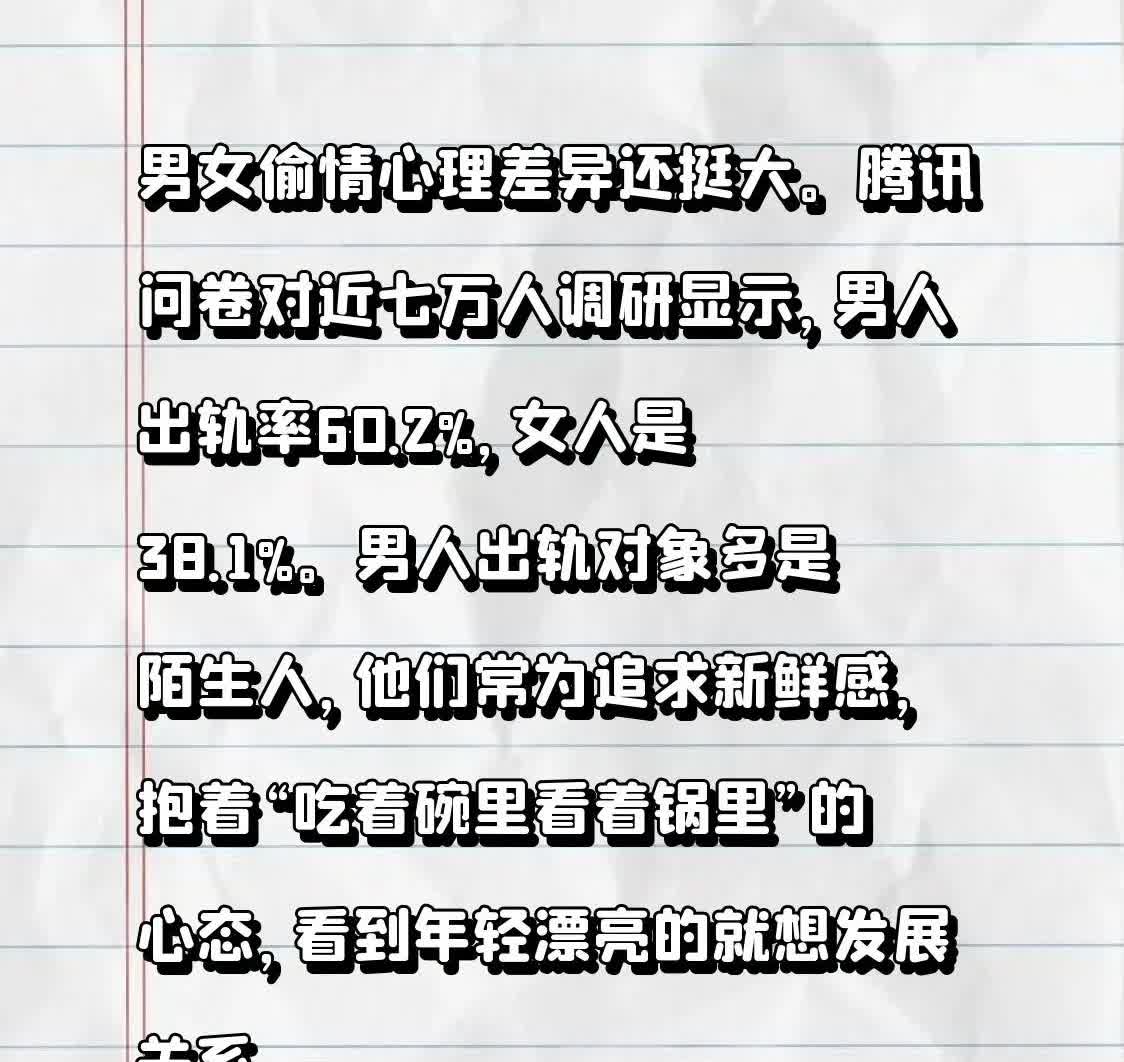 男女偷情时的心理差别可真是相当大呢。有调研显示,男人的出轨率达到了60.2%,而