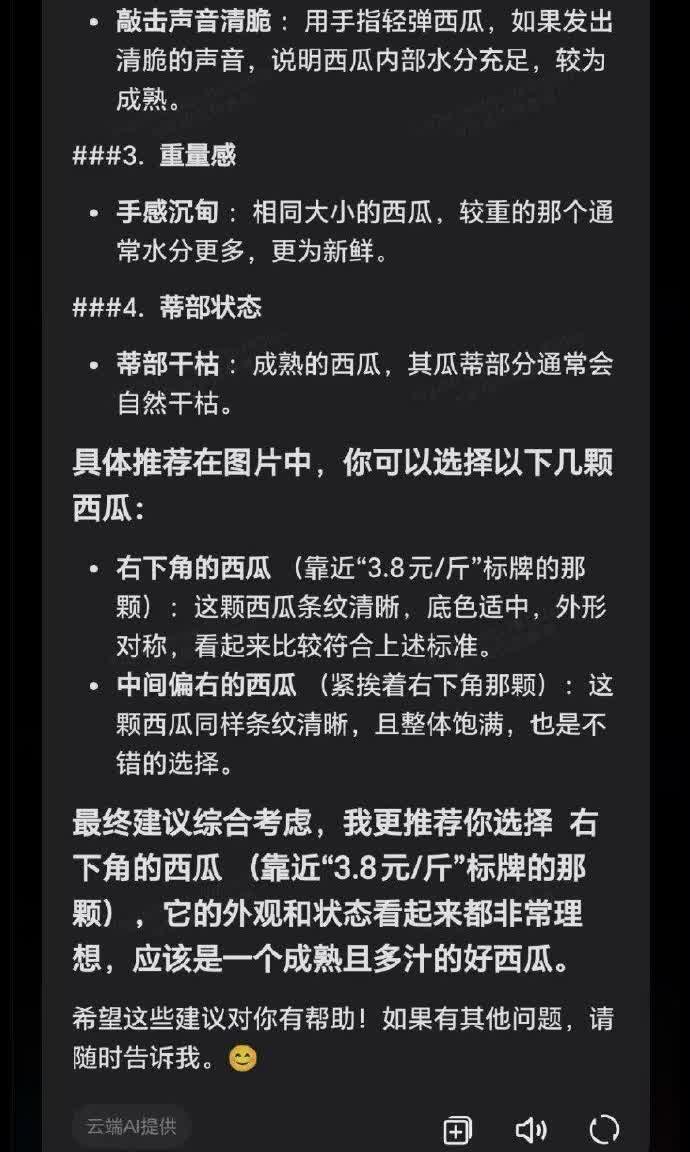 我发现荣耀400 Pro的YOYO居然还能帮你挑西瓜! 有一晚我去水果店,看着一堆西瓜不知道买哪个好,于是灵机一动掏出荣耀400 Pro拍下西瓜照片,发给YOYO问它选哪个好,它帮我选了两个说包甜,我半信半疑买了一个回家,切开来发现YOYO确实靠谱,这西瓜甜过初恋……