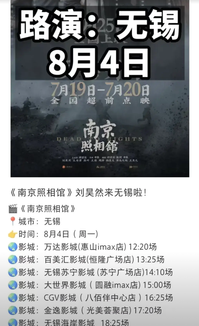无锡出品电影&刘昊然参演: 1.已打破《南京照相馆》已破2025非春节档票房记录。 2.出品方为中影(无锡)电影制片有限公司,位于惠山区钱桥街道。 3.刘昊然8.4无锡路演行程,速度收藏。