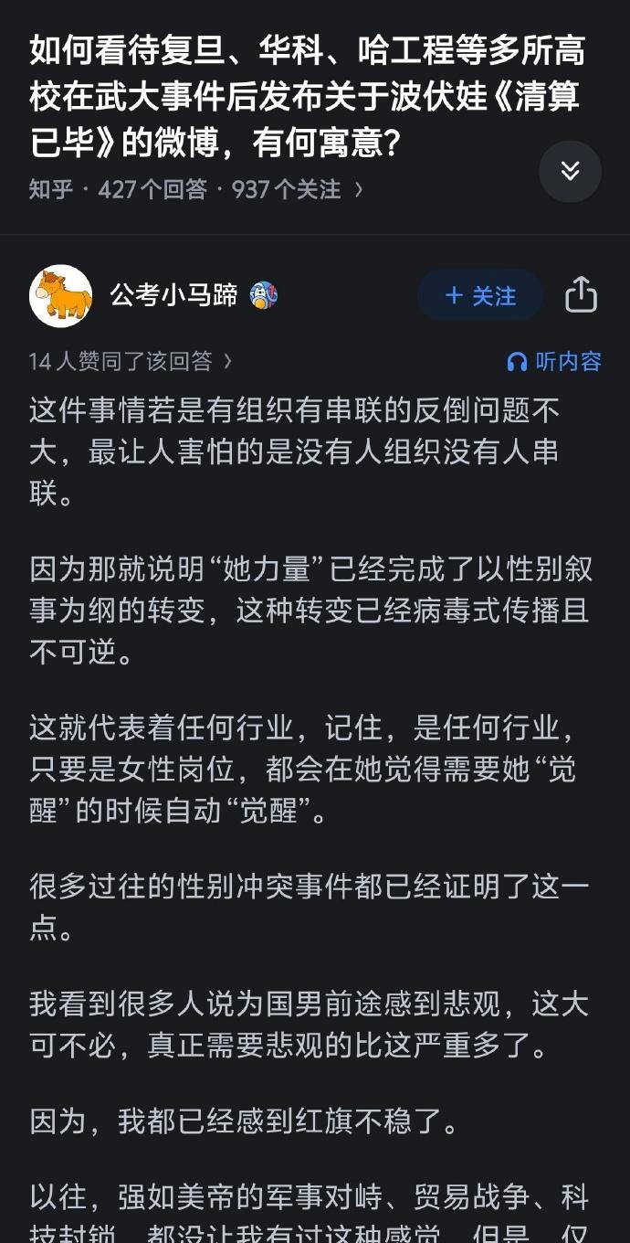 慌什么,要相信人民群众的觉悟和党的力量!我们还有子弟兵的嘛[比心]。 不就是一群需要人民再教育的腐儒在上窜下跳嘛,它们要是能成事早就动手了。 自信点,中国五千年的文化底蕴和价值观足以对抗西方女权思想侵蚀! 现在网上清醒的人是大多数,性别对立的文案大家一眼就能看出来了……现在要的就是让它们自我暴露[如花]。