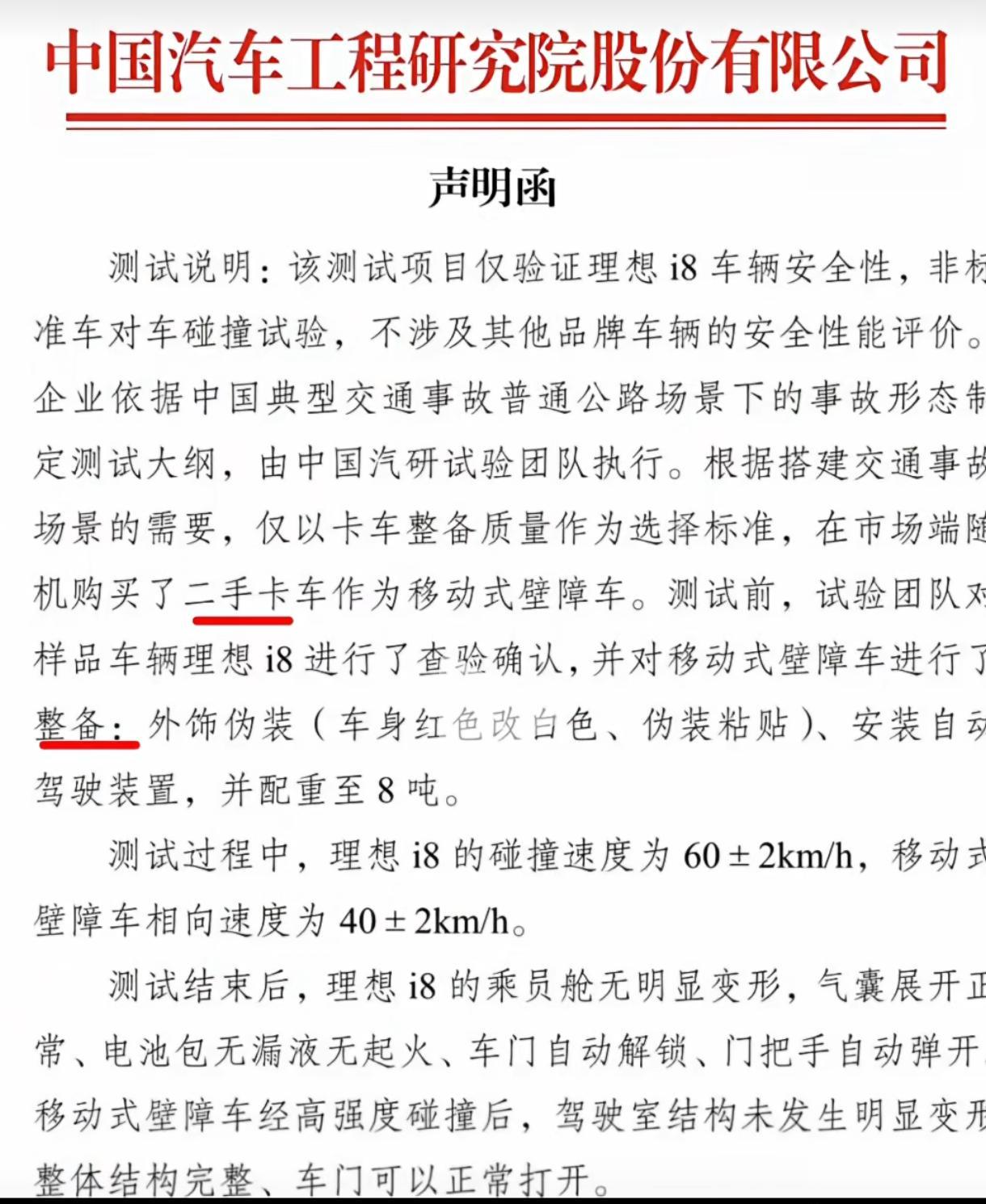 太尴尬破防了!继乘龙卡车硬气回应理想i8可以进行直播碰撞测试之后,中国汽研和理想同时发声!老实说没有想到反转来的这么快,事情的起因是这样的: 1、近期在理想汽车i8的发布会上!理想发布了一段碰撞测试,也就是为了测试他们这款车的安全性,反正就是宣传吗?但是结果呢!卡车的车头向前倾斜,甚至出现了四个轮胎都出现了弹起 2、随后眼尖的网友就发现,这辆车是来自于东风柳汽的乘龙汽车。关键是测试结果有点离谱,因为理想i8的车子重量才2吨多,而乘龙汽车自重就有8吨,这个结果有点违背物理常识。同时乘龙汽车官方也回应了,意思就是有汽车想要碰瓷我们,但是我们不怕测试 3、而理想的高管同时也在7月31日发文称,我们相信权威机构的专业,要不来复测一把!随后东风高管也回应了,可以啊!直播都行 4、但是当大家都在等这场直播的时候,理想和中国汽研同时在8月3日发声了。其实说白了理想就是很硬气,到现在只字不提重新复测的事情了。关键一句道歉都没有,就说自己属实是无心之举!无意做出来质量结果论断! 而中国汽研也说了实话,大概意思就是说:你理想汽车过来找我碰撞测试,且制定好了测试大纲,而我中国汽研只是执行。后面又说,我可从来没公开发布任何测试相关的资料,都是你理想汽车发布的。同时还强调了,这是一台二手汽车,同时也进行了整备,同时安装了自动驾驶装置等 现在其实比较尴尬的就是理想的高管!前面还口口声声和乘龙汽车叫板,可以复测!同时表示相信权威机构的专业,要不来复测一把。说句实话,他们估计做梦都没有想到!最后还是搬起来石头砸了自己的脚 关键的问题还是你这么一撞不要紧,对于乘龙汽车的影响真的很大。毕竟这可是大卡车,拉货的还不如一个2吨的家用车耐撞!谁以后还敢相信,其次是中国汽研还没有调查清楚,理想高管就直接下场信誓旦旦表示第三方企业测试能力很权威和专业。 但是距离现在才3天时间,中国汽研就坐不住了啊,同时表示这就是二手车,而且我们还整备了,已经调查清楚了。这个时候理想你说尴尬不尴尬,自己保证碰撞公平权威。接下来反而是李想找的第三方公司首先爆料了真实情况,视频中的乘龙汽车是二手的,还是整备过的。 说的直白点,事情本身没有啥问题。比如这个车速和车辆的情况,理想i8的安全性不错。但是错就错在了他们不该那么相信第三方公司找来的车子,同时竟然还厚颜无耻说可以复测。结果呢!第三方机构说碰撞的车子是二手的,这不就是汽车评测机构的问题了。其实问题的关键就看接下来的直播还搞不搞了,大家怎么看