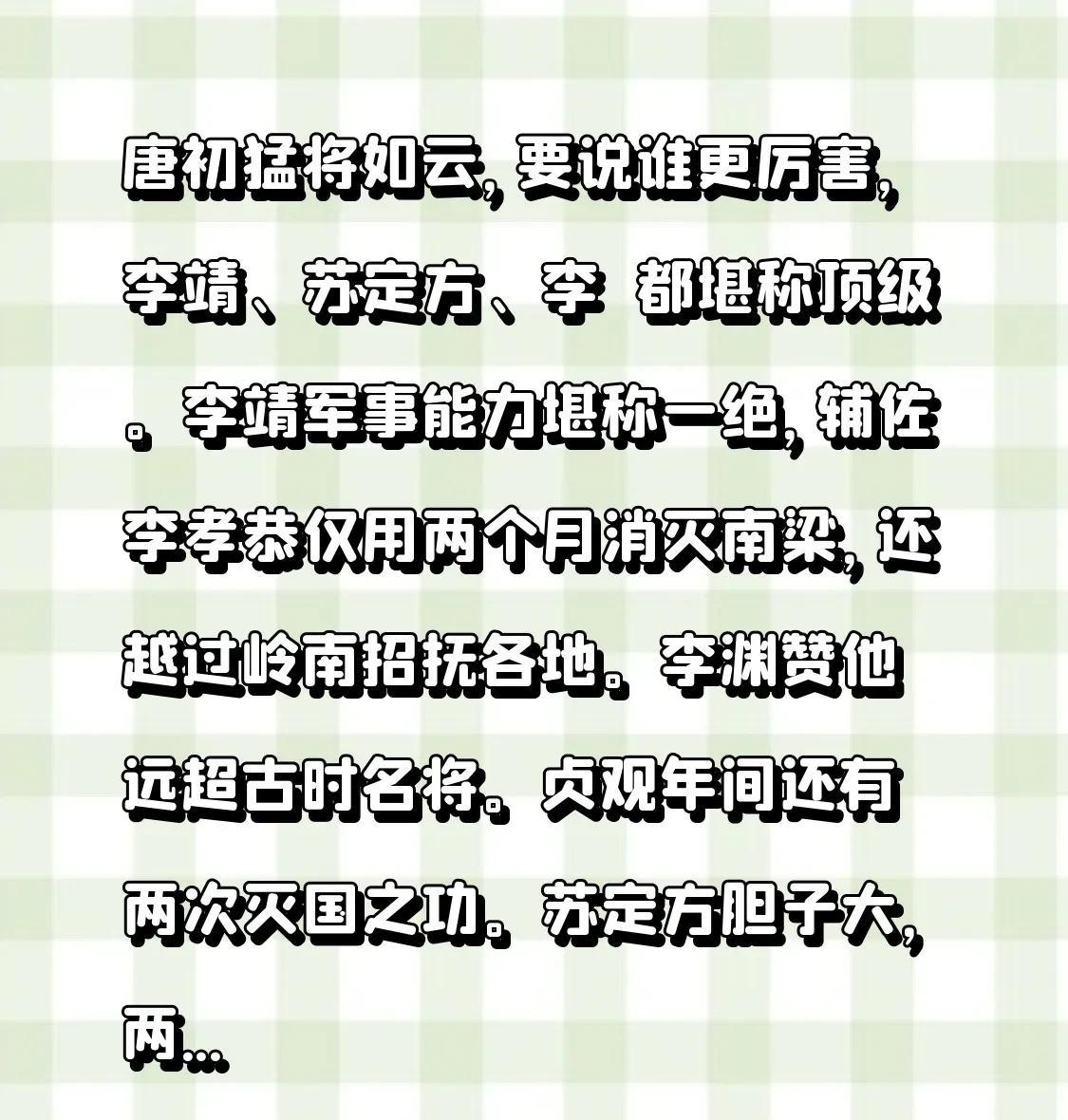 唐初猛将如云,要说谁更厉害,李靖、苏定方、李勣都堪称顶级。 李靖军事能力堪称一绝,辅佐李孝恭仅用两个月消灭南梁,还越过岭南招抚各地。李渊赞他远超古时名将。贞观年间还有两次灭国之功。 苏定方胆子大,两百骑兵夜袭敌营吓退突厥可汗。李治时东征灭三国,西北收拾吐蕃。 李勣十七岁奔瓦岗寨,二十二岁伏击张须陀成名。他们各有千秋,很难评判谁最厉害。