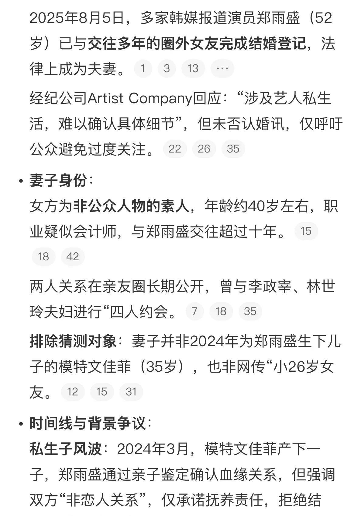 52岁郑雨盛登记结婚,和女A生孩子,和女B交往,和女C结婚,韩.媒让大家祝福这对夫妻。 2024年郑雨盛遭韩.媒爆料有私生子,他与35岁辣模文佳菲2022年相识,女方在3月秘密产子,直到6月才告知他是孩子生父。 两人虽没交往,但郑雨盛通过亲子鉴定确定了与孩子的血缘关系,愿意担起父亲的责任,一起养育小孩。只是,郑雨盛其实另有稳定交往的圈外女友,女方知晓此事陷入了冲击。 近日,郑雨盛被曝已完成婚姻登记,新婚妻子并非孩子生母文佳菲,正是相恋多年的圈外女友。其妻子为40岁左右的会计师,与郑雨盛交往已超过十年,两人关系长期在亲友圈公开,曾与李政宰、林世玲夫妇进行“四人约会。 2025年8月初完成法律登记,终结了自2024年私生子风波以来的感情状态争议。经纪公司回应称:“涉及艺人私生活,难以确认细节”,未否认婚讯,但呼吁公众避免过度关注。