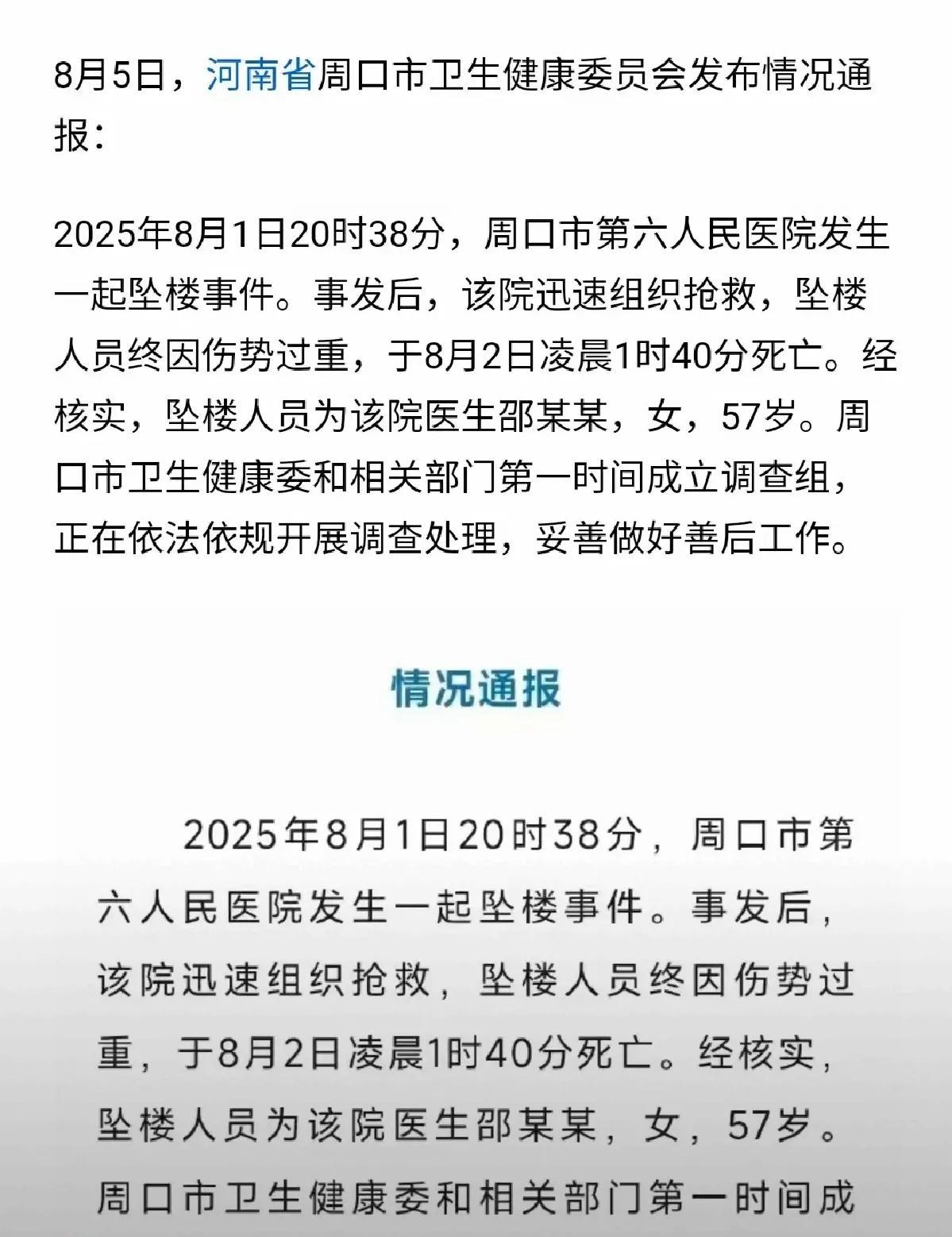 经过几天的发酵,今日中午有了官方通报,周口卫健委、医院已经成立调查组…… 在当今社会发展进程中,医生也成了高危行业,不是被患者追杀,就是被逼跳楼,或者被造谣惑众而遭受网暴舆论致死…… 河南省周口市第六人民医院57岁的妇产科主任邵晓蓓,在8月1日晚与家人通话之后,留下一张写着“请为我正名”的遗书,便跳楼自尽,结束了自己的生命。 邵医生用生命换来了网络舆论的反转,铺天盖地的谴责朝着医闹者涌去,之前对邵医生的各种污蔑声音淹没了… 据说压垮邵医生的不只是今年5月18日被邵医生救过性命产妇一家的网暴,近几年她多次被医闹肆意诋毁、威逼利诱,压得她喘不过气来,在多次求助无门、不堪继续受辱的情况下,最终以死来表明自己的清白…… 为何在百般煎熬之中,没有调查组第一时间出现?为何在邵医生绝望的没有退路时,没有人依法依规开展调查处理? 总是要等到悲剧发生后,才引发人们的关注。医院没有看到患者在网上的污蔑造谣吗?逼得自己的医生精神崩溃,医院的领导、卫健委及职能部门为何不出面为邵医生解释辟谣? 邵医生荣获众多荣誉,医术精湛,这么好的大夫,当患者全家到医院大闹并且围攻她的时候,为何没有人出面维护她?为何没有人为她说句公道话?既然邵医生也报了警,可网络暴力为何越来越凶? 如果这件事情能够及时得到解决、被制止,有人为邵医生撑腰,那么患者一家还会如此猖狂吗?正是各方的沉默,才使得医闹们更加变本加厉的报复,网上越传越多越离谱,又被不明真相的吃瓜群众炒作,这张黑暗的网害死了邵医生…… 人已经死了,即便再抚慰家属,承诺妥善做好善后工作,一切的一切都已经晚了,即便再树立邵医生的口碑也无济于事。相关部门如果能第一时间介入,结果还会是这样吗?医闹无赖还会如此嚣张吗?农夫与蛇的故事还会发生吗?