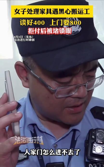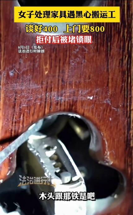 “太坏了!”近日,一女子要处理家中的旧家具,就找了一个搬运工,二人谈好400元,可搬运工到现场看后却突然加价到800元!女子自然没有同意,没想到,搬运工临走之前,竟然用木头和铁丝堵死了锁眼,女子发现打不开门后就报了警。网友:太嚣张了! 搬家是很多人都讨厌的事情,一屋子的东西收拾起来特别麻烦,而且到了新家后还要再摆放整齐,很是累人,好在现在有不少搬家公司,能够减轻不小的压力,但有些人却非常黑,喜欢坐地起价。 据媒体8月5日的报道,前不久,一位大姐家中有些旧家具要处理,由于小区里没有电梯,阿姨一个人搬不动,于是就找了一位搬运工师傅。 二人协商后,最终订好了价格:400元。 不一会儿,师傅就根据定位来到阿姨家中,他在查看完要搬得东西后坐地起价,直接把费用翻了一倍,要求支付800元,否则就不搬。 阿姨没有同意,就让师傅离开了,只是她没想到的是,师傅竟然堵死了锁眼来报复阿姨。等到阿姨开门时,却发现钥匙插不进去,最终报警处理。 在民警的陪同下,开锁师傅拆开了门锁,发现里被塞满了木头和铁丝,民警联系了那名搬运工,对方确认表示“不知道”。 最终民警亲自找了一位搬运工,将要搬得东西拍照发给对方后,人家表示200元就够了! 不得不说,每个行业都有“老鼠屎”,各行业应该加强管理,才能避免老鼠屎坏了一锅粥。 大家对于这件事是怎么看? 信息来源:《女子处理家具遇黑心搬运工 谈好400 上门要800 拒付后被堵锁眼》法治进行时