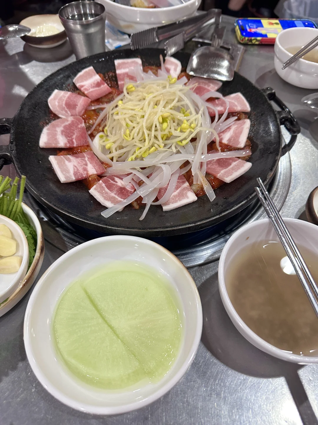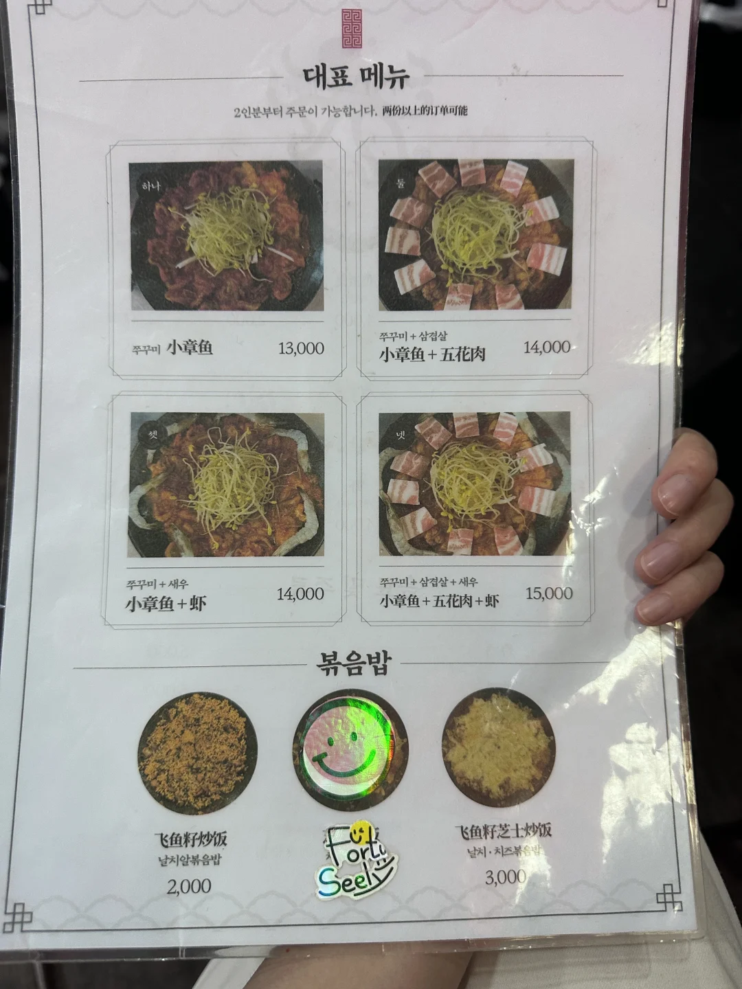 济州岛这家辣炒小章鱼🐙真的很好吃!!店铺门头在第二张图片里面 看起来普普通通 点的是两人份辣炒五花肉小章鱼 简直不够吃 小章鱼感觉很新鲜 甜甜的 又很辣 疯狂喝水 一定要多加小章鱼和粉条 吃完最后炒一份饭 拌着紫菜煎蛋 巨好吃!爱吃碳水绝对不踩雷!!价目表在最后!被首尔物价pua了 到了济州岛居然感觉蛮便宜的 济州岛辣炒章鱼