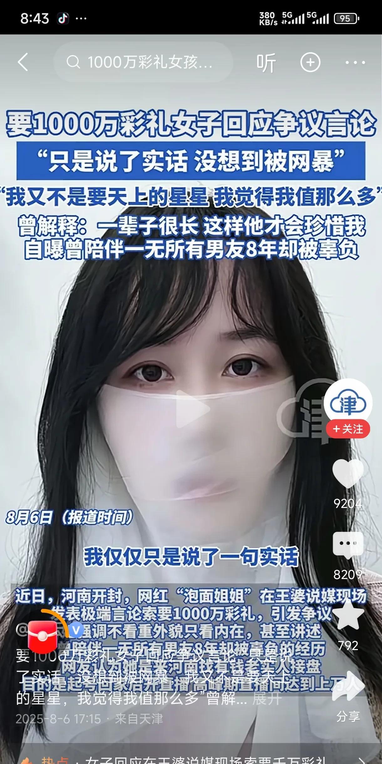 泡面姐因为一句无知的1000万彩礼被推上风口浪尖。 成为网友们网暴的对象之一。此