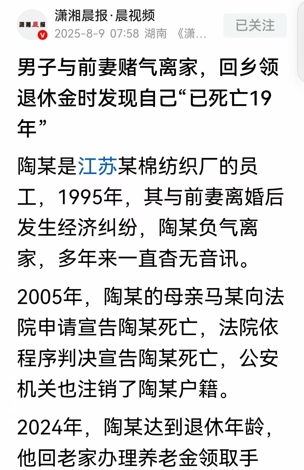 江苏,一男子跟前妻离婚后,两人因为钱大吵一架,男子一气之下离家出走,10年后,母亲看他生不见人死不见尸,以为他死了,就向法院申请宣告男子死亡,他的户口也被注销了,万万没想到,19年后,男子竟大摇大摆的回老家领养老金,这才惊讶的发现自己“死”了,他愤怒的起诉到法院,要求撤销死亡,法院判决出乎意料。 8月9号,据潇湘晨报·晨视频报道,陶先生跟妻子离婚后,可却剪不断理还乱,两人因为经济问题,还是纠缠不清。 陶先生本身就是个没啥心胸格局的人,惹不起还躲不起吗,他一怒之下,负气的离家出走了。 按理说,他跟前妻有纷争,躲着她有心可原,可他竟然从此音讯全无,连父母家人都不联系。 母亲思儿心切,等了一年又一年,可陶先生犹如人间蒸发了一样,10年后的2005年,母亲马女士不得不在心里接受了一个残酷的事实,那就是儿子已经不在人世了。 马女士想当然的认为。儿子这一走要么是遭遇不测,要么是想不开自寻短见了。 悲痛不已的马女士,向法院申请了儿子的死亡,这样的话,她就断了心里的念想,不再望眼欲穿,心存幻想了。 随后,陶先生被宣告死亡,户口也被注销。 而马女士哪里会想到,自己的儿子不但活着,还活的好好的,儿行千里母担忧,但他却从没把父母放在心里,自己远离是非,过惬意日子,早就忘了父母膝前尽孝的义务。 就在陶先生户口被注销19年后,他也到了退休年龄,竟然大摇大摆的回家办理领取退休金手续来了。 他的出现,让所有人都吃惊不小,尤其是家人,而陶先生这才得知,自己已经死亡19年了。 陶先生此时,也不知道是否反思了自己的行为,还是怪母亲无情,反正他是挺气愤的,随后,他向法院申请撤销宣告他死亡的判决。 法院认为,其符合撤销死亡宣告的实质要件和程序要件,依法撤销了宣告其死亡的判决。 有人说,他的母亲到法院申请宣告儿子死亡有什么目的?一般母亲总是希望儿子活着,哪有自己赶着上法院申请儿子死亡的。 还有人认为,跟妻子吵架负气离家出走,跟自己的母亲有什么关系,这么多年对母亲不闻不问,这是一个儿子该做的事吗? 既然有人证明其确实没死,其户籍虽然注销,但还是可以补救恢复的!50年的案都可翻,况且19年的案! 有人质疑,问题是,他29年前消失,这么多年他是怎么生存的,身 份 证早过期了,人都“没”了,工作单位、人口普查他是如何漏掉身 份的?就是要饭,收容所也要身份呀。 一个不负责任的人,跟前妻有经济纠纷,就玩消失29年,太不成熟了。老妈去派出所办理你死亡手续,心里是多么的绝望、悲伤! 还活着恢复身份没问题,但是领取养老不应该,对其他人不公平,自己放弃责任,没有继续交,现在老了就想吃白食? 还有人同情陶先生,家家都有一本难念的经,各有难处。老婆不历害男人会出家离走吗?就是避开母老虎折磨。出外打工变得一身轻松。如果家里没有一个历害的女人男人会离家吗?老了做不动了该回家还是回家。是男人应该同情男人不要质疑。 《民法典》第46条规定:自然人有下列情形之一的,利害关系人可以向人民法院申请宣告该自然人死亡: (一)下落不明满四年; (二)因意外事件,下落不明满二年。 宣告死亡的目的,是解决因长期失踪导致的民事法律关系不稳定状态,以保护利害关系人权益。 陶某自1995年离家出走失踪满10年,远超《民法典》第46条第一项“下落不明满四年”的期限。 其母马某作为利害关系人,于2005年申请宣告死亡,法院经公告程序后作出判决,符合法律规定。 长期失踪导致财产继承、婚姻解除等现实问题需解决,马某申请宣告死亡既是权利行使,也是对法律秩序的必要维护。 《民法典》第50条规定:被宣告死亡的人重新出现,经本人或者利害关系人申请,人民法院应当撤销死亡宣告。 该条款明确,只要被宣告死亡人实际生存,即可通过法律程序恢复其民事权利和身份。 2024年陶某重新出现,根据《民法典》第50条,其本人可直接向法院申请撤销死亡宣告,法院经核查其生存事实后依法撤销判决。 死亡宣告撤销后,陶某恢复民事主体资格,婚姻关系,若配偶未再婚,自动恢复,被继承的财产应返还原物或折价补偿,但本案未涉及具体财产争议。 针对 “母亲为何主动申请儿子死亡”的质疑,马某作为母亲,长期无法联系陶某,需通过宣告死亡解决财产、继承等现实问题,并非主观“诅 咒”儿子,而是合法权利的行使。 法院撤销死亡宣告后,陶某可持生效判决向公安机关申请恢复户口登记。 若陶某在失踪期间未缴纳社保,其退休金可能因缴费年限不足受影响。 但养老金权益属保障范畴,需结合社保另行处理,与死亡宣告撤销无直接关联。 对此,你怎么看? 关注@运良说法 学法律知识不迷路 #头号创作者激励计划#