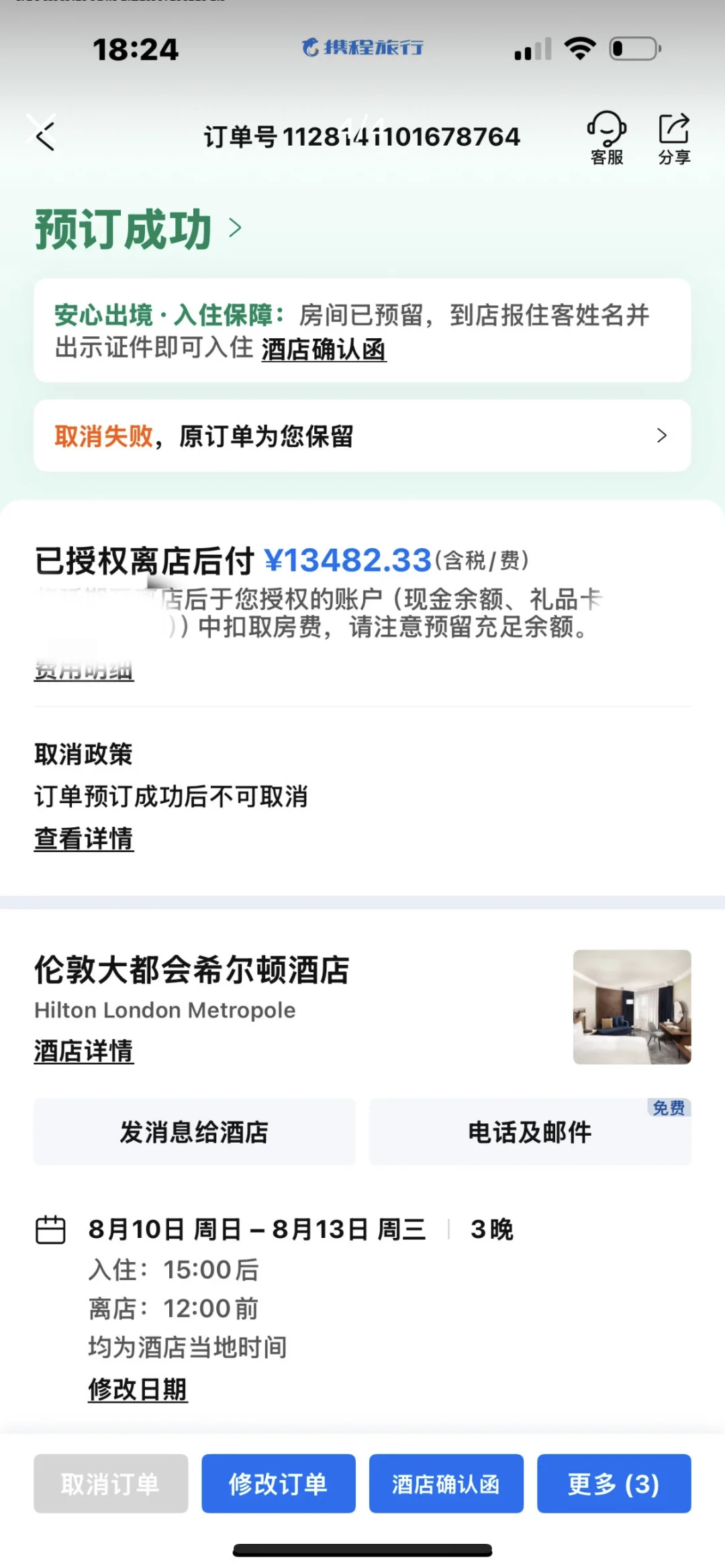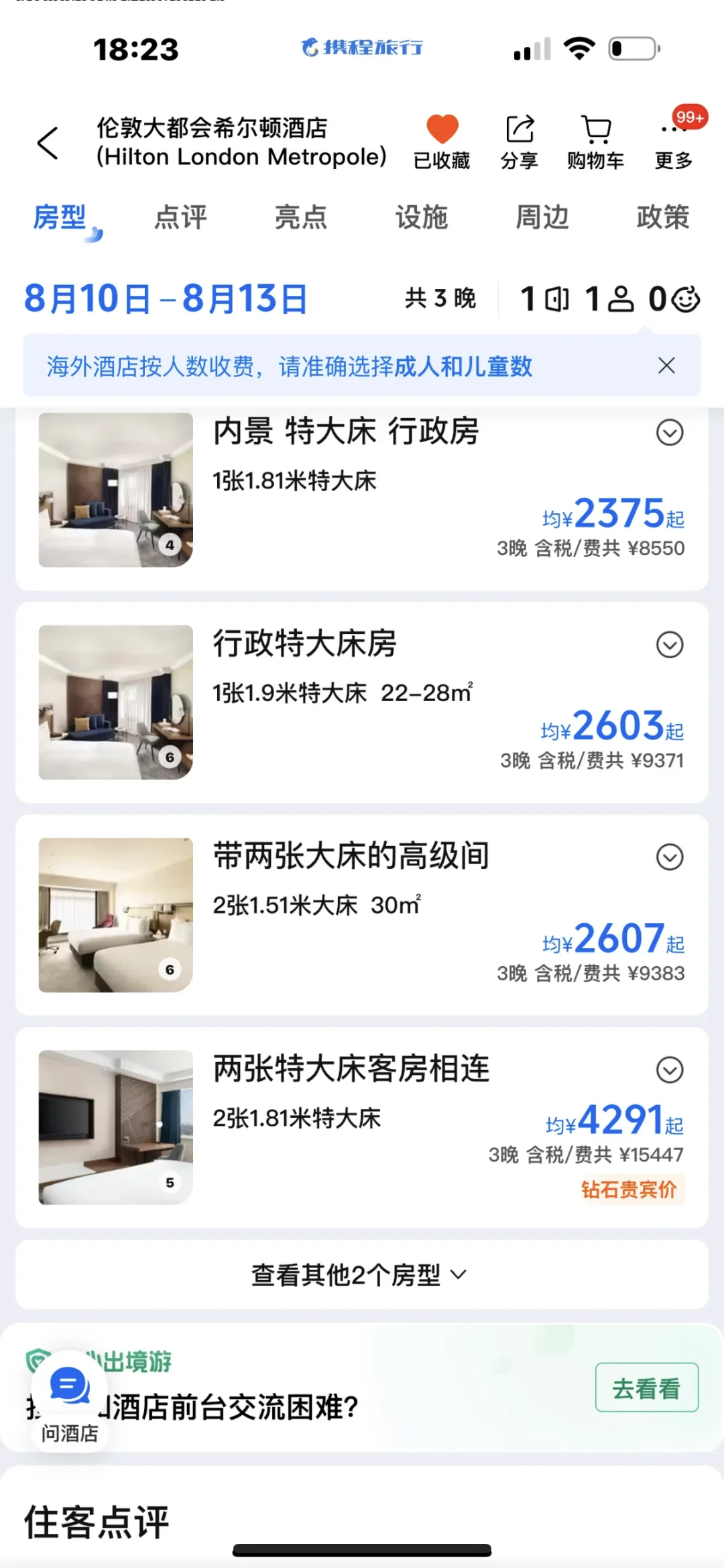 急!急!急!在伦敦的朋友们,因为签证问题,行程要改期,原定的伦敦大都会希尔顿的房间需要转出,当地时间10日到13号,含三份早餐,5折出。是两张特大床客房相连,两个房间,可以4个人入住。原价13482,现在6800 有需要的联系金