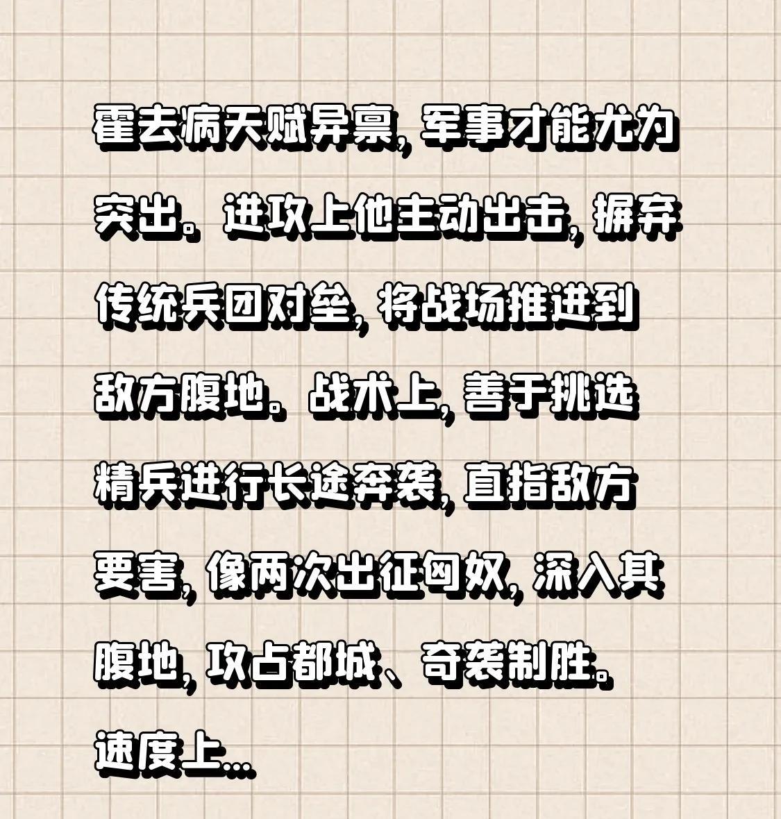 霍去病天赋异禀,军事才能尤为突出。进攻上他主动出击,摒弃传统兵团对垒,将战场推进到敌方腹地。战术上,善于挑选精兵进行长途奔袭,直指敌方要害,像两次出征匈奴,深入其腹地,攻占都城、奇袭制胜。速度上,他堪称“闪电战”古代先驱,神兵天降般出现在敌人面前,制造混乱瓦解敌军。“出奇制胜”是他的灵魂,每次重大胜利几乎都靠奇谋与迅猛行动创造军事奇迹,年纪轻轻便在战场崭露头角。