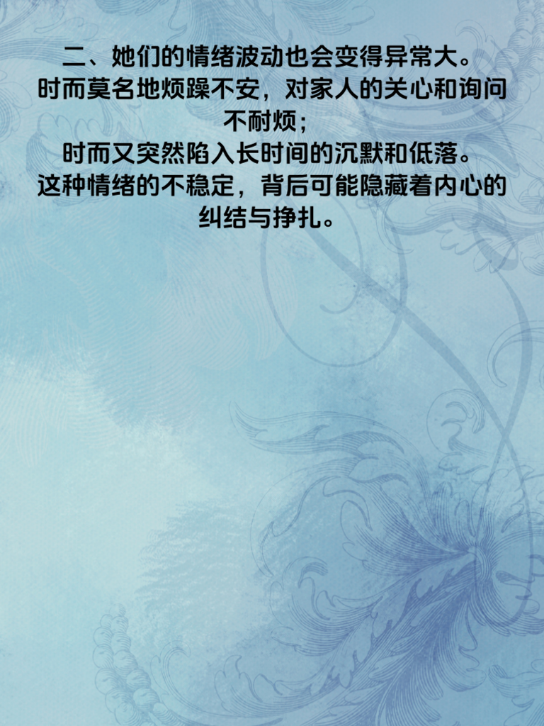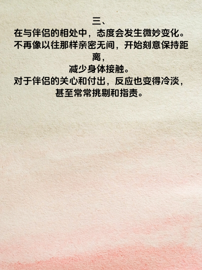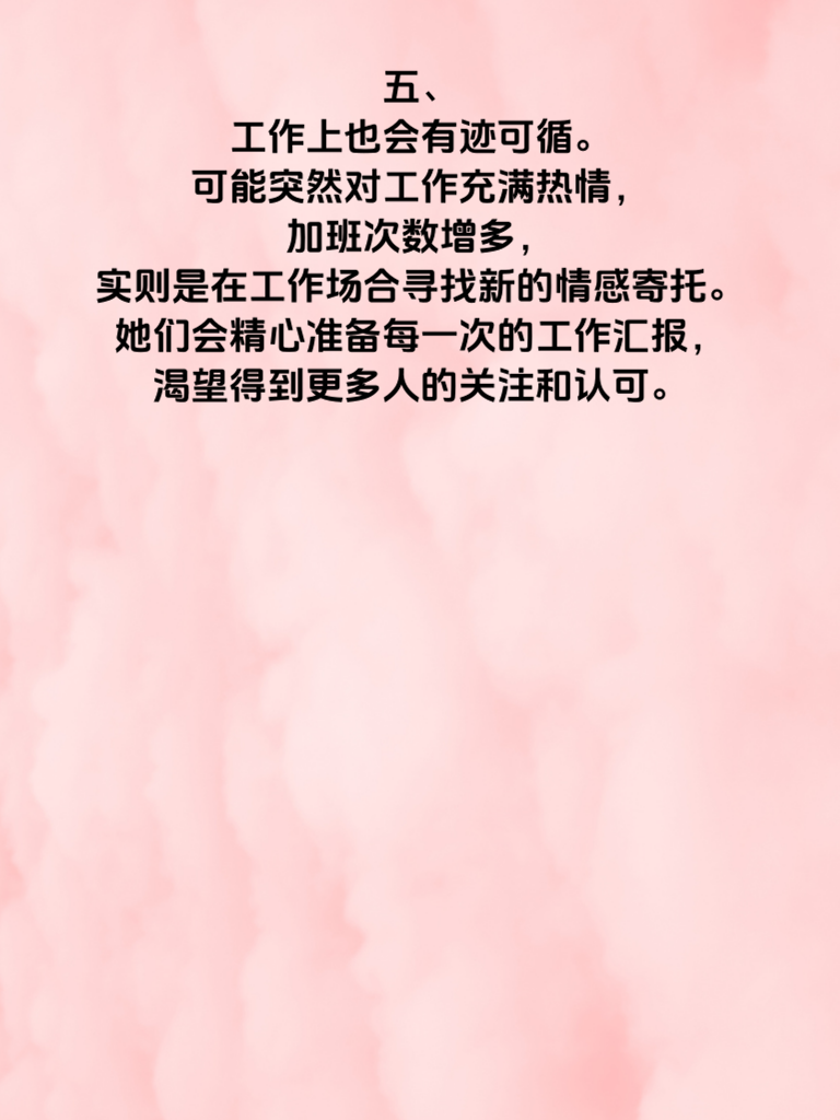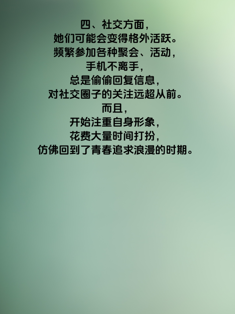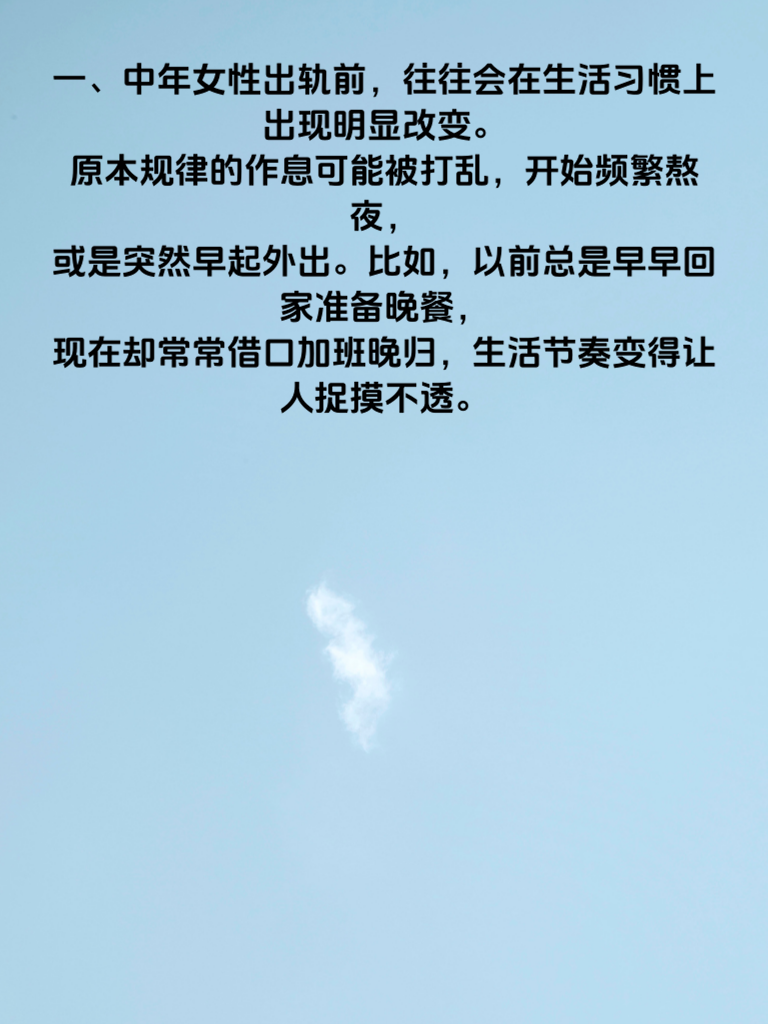 一、中年女性出轨前,往往会在生活习惯上出现明显改变。原本规律的作息可能被打乱,开始频繁熬夜,或是突然早起外出。比如,以前总是早早回家准备晚餐,现在却常常借口加班晚归,生活节奏变得让人捉摸不透。 二、她们的情绪波动也会变得异常大。时而莫名地烦躁不安,对家人的关心和询问不耐烦;时而又突然陷入长时间的沉默和低落。这种情绪的不稳定,背后可能隐藏着内心的纠结与挣扎。 三、在与伴侣的相处中,态度会发生微妙变化。不再像以往那样亲密无间,开始刻意保持距离,减少身体接触。对于伴侣的关心和付出,反应也变得冷淡,甚至常常挑剔和指责。 四、社交方面,她们可能会变得格外活跃。频繁参加各种聚会、活动,手机不离手,总是偷偷回复信息,对社交圈子的关注远超从前。而且,开始注重自身形象,花费大量时间打扮,仿佛回到了青春追求浪漫的时期。 五、工作上也会有迹可循。可能突然对工作充满热情,加班次数增多,实则是在工作场合寻找新的情感寄托。她们会精心准备每一次的工作汇报,渴望得到更多人的关注和认可。