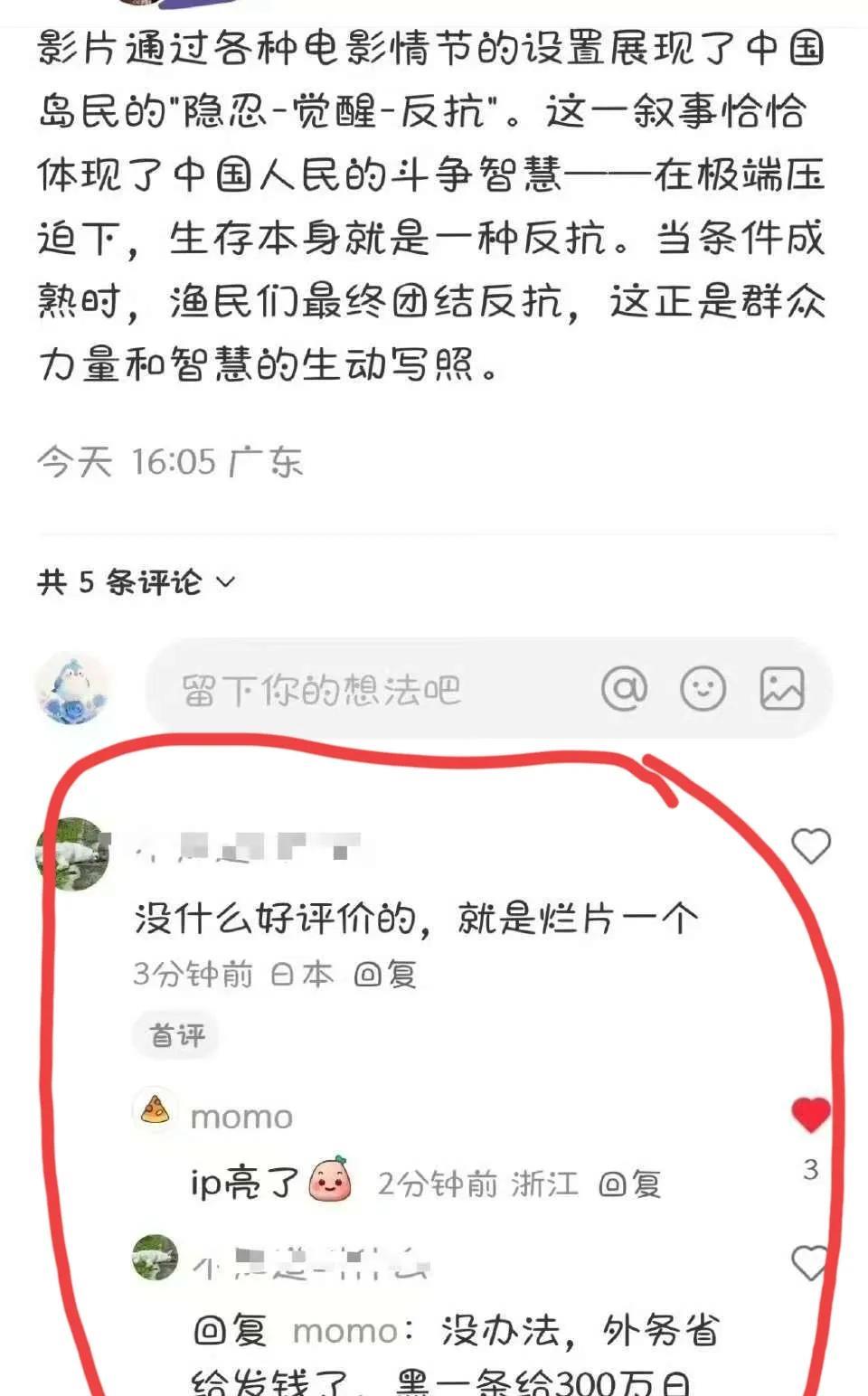 中国渔民发现后赶来救人,冒着日军残酷枪杀的危险,救走384个英国人。 就在同年10月,日本官媒厚颜无耻的向全世界宣告:我们奋力抢救起了数百名英国俘虏。 突然间,日本由血债累累的屠杀者摇身一变成为人道主义国家。 随着《东极岛》的上映,日军犯下的滔天罪行和撒的弥天大谎藏不住了。 于是有了日本外务省增加反日预算,图十一。430名日本间谍组织水军围剿《东极岛》的报复性绞杀事件发生。图十。 来自日本IP的一个‘人’在《东极岛》的评论区喜形于色的写到:没什么好评价的,烂片一个。没办法,外务省发钱了,黑一条给300万日元,我已经赚了600万日元,羡慕吧! 可恨的是有些国人没有同仇敌忾一起抗日,反而领了外务省的狗粮不遗余力做起了帮凶。 我的评论区昨天来了好多反《东极岛》的‘人’,有的带着她偶像头像就这么明晃晃的反复黑这部电影。还口吐莲花素质‘好’到令人作呕。图一 不理解的是《南京照相馆》的所谓‘影迷们’,同样做着不可理喻的事情,捧一踩一。我想说:本是同根生,相煎何太急? 是啊!蛋糕就那么大,我不把你踩死,你就会分走我一杯羹。阴暗的心理昭然若揭,在国家大是大非面前居然如此小家子气,我对这个导演有了新的看法。 还有拿纪录片里斯本丸沉没说事的,图三。可导演方励先生在《东极岛》首映礼上说的是:你们做了一件很了不起的事,居然能把里斯本丸故事搬上荧幕。我可能更多讲的是里斯本丸和这群受苦难的英国人,而你们讲了我国渔民冒着日军枪杀的危险救人。可以说是《东极岛》让这个真实的故事显得更加完整。 文中每一张图片都是真实的血淋淋的控诉,杀死《东极岛》于你们的好处就是那么一点 狗粮费。够你们享用一辈子了,对吧!对于他们这些汉奸走狗而言人声短暂。那点狗粮够用了。 论持久战还在进行中,抗日战争没想到我们这一代还要继续传承。不是机枪大炮,而是网络上看不见的舆论战,争夺话语权。 《东极岛》是一部好电影,我告诉路过的朋友们,别听信所有黑子的言论,我说的很清楚了,都有证据了。想看的一定去看看,别被古惑。看了才知道倒地好不好,做个历史事件的见证人。《东极岛》被绞杀已经成为一件事件留在中国影史上。