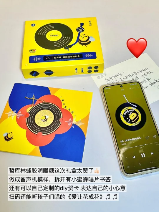 做成留声机模样,拆开有小蜜蜂唱片书签,
