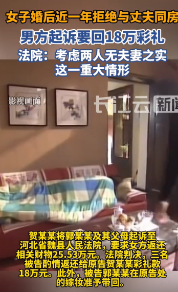 河北邯郸,一男子与未婚妻办了婚宴后,未婚妻就一直不同意发生关系,甚至还分房睡。男子在忍了11个月后,提出了分手,并要求未婚妻返还25万元彩礼。可未婚妻却不同意,表示二人已共同生活了3年多时间,彩礼是不可能返还的。没想到,法院这样判! 据汉水襄阳8月10日发布,贺先生(化名)才二十多岁,家里人为他安排相亲,相亲时碰见了郭女士(化名)俩人在相处过程中,对彼此都有意思。 贺先生虽然才二十多岁,但是家里人为她的婚姻大事愁的不行,觉得男人先成家才是头等大事。于是,家里人找媒婆给贺先生张罗着相亲,相亲过程中,贺先生还真有看对眼的!他和郭女士一见面,就被郭女士那美丽的外表和阳光的性格所吸引。 俩人在交谈的过程中,也觉得可以聊到一起,想法对未来的发展都大致一样。于是,没过多久,俩人谈起了恋爱,过了一段时间,在家里人的催促下,双方在2021年5月先订了婚,因为郭女士比贺先生小两岁,所以女方家里人觉得先定着,等稳定了再结婚。 2024年3月,双方家长见俩人感情一直不错,便决定把婚宴办了,但并没有领结婚证,想着选个好日子再去领。根据当地习俗,贺先生家拿了20多万彩礼加上三金还有电器之类的东西,共计25.5万元。 贺先生觉得结婚以后,两个人的生活会越来越好,小两口能幸福美满,甚至很快生下爱情的小结晶。 可令人没想到的是,俩人结婚没多久,郭女士觉得他俩没什么太大的感情基础,所以一直不让贺先生碰她,自举行婚礼后同居生活11个月时间未发生关系。 而且郭女士总是以各种理由和借口外出,就是回家也是分床居住。贺先生是个正常男人,哪里能忍受没有性生活的婚姻,他要求发生关系,但是郭女士就是不让碰,后来俩人就因为各种矛盾吵得不可开交,双方在2025年2月开始分居。 刚开始,贺先生以为郭女士只是闹脾气,可后来俩人竟然都不联系了,贺先生再也不能忍受这种有名无实的婚姻,于是提出了离婚。但郭女士说如果贺先生想要离婚,彩礼就不能退给他,毕竟是他提出来的。 而且身边人都知道,俩人已经生活这么长时间,自己名声都不好了,还说在农村里谁提出退婚,谁就不要彩礼了。 贺先生哪能认同她这个想法,自己家的钱又不是大风刮来的,于是他起诉了郭女士,要求返还相关财物共计25.5万元。 法官经过调查说,郭女士和贺先生没领证,女方不愿意同房也不算错,毕竟不是真夫妻,她没义务必须同意,不过俩人办了婚宴后确实一起共同生活过了 11 个月,让郭女士全还彩礼也不太公平。 最终,法院判决女方返还彩礼18万元,女方在男方家的嫁妆准予带回。 此事一经发出,网友们纷纷评论。有人说:“必须保护婚姻,哪一方破坏婚姻,哪一方必须得到法律的严惩。不论是男方和女方,结婚就要履行法律。生儿育女的义务。” 还有人说道:“必须保护婚姻,哪一方破坏婚姻,哪一方必须得到法律的严惩。不论是男方和女方,结婚就要履行法律。生儿育女的义务。” 对此你怎么看?欢迎大家在评论区留言讨论。