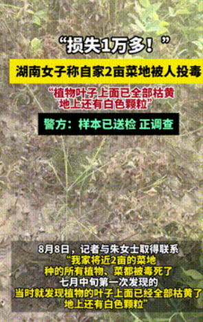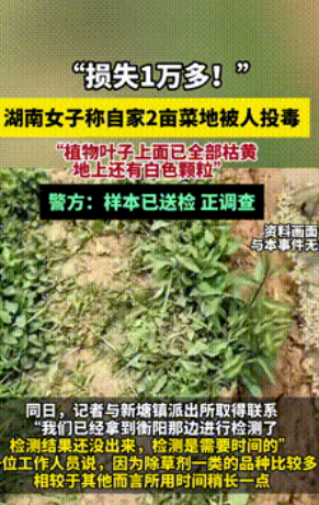 必须严查到底!”湖南衡阳,一女子到菜地摘菜时,竟发现一大片作物的叶子全部枯黄,而且地上还有白色颗粒!起初女子没有多想,没成想几天后,菜地再次出现相同的情况,女子便怀疑有人蓄意投毒,二话不说报了警!网友:太狠了,想想就后怕! "这可是我的命根子啊,如果不能种植我今后可怎么办啊!"女子哭诉着说道,谁能想到一起看似普通的农作物受损事件,背后却隐藏着令人不安的真相。 朱女士是当地一位普通农户,家中种植了红薯、白薯、花生等多种作物,这片近2亩的菜地是她全家的主要经济来源,据她回忆第一次发现异常时,她正像往常一样到菜地摘菜。 突然看到一片区域内的作物叶子全部呈现不自然的枯黄色,与周围健康作物形成鲜明对比,更让她感到奇怪的是,这些枯黄作物的根部周围散落着一些细小的白色颗粒状物质。 然而几天后当她再次来到菜地时,震惊地发现另一片区域的作物也出现了完全相同的情况——叶子枯黄、根部有白色颗粒,这种重复出现的异常现象让她警觉起来,"正常情况下病虫害不会这么有规律地出现,更不会留下这种奇怪的白色颗粒"。 带着满腹疑虑朱女士仔细检查了整个菜地,发现受损面积已达近2亩,预估经济损失超过1万元,对于一个普通农户家庭来说,这无疑是一笔巨大的损失,"这些作物是我们家一年的指望啊,眼看就要收获了,却突然变成这样..."朱女士哽咽着说。 意识到可能有人故意破坏后,朱女士毫不犹豫地拨打了报警电话,接警后派出所迅速派出民警赶赴现场调查,民警在现场采集了枯黄作物样本和那些可疑的白色颗粒物,并将样本送往专业机构进行检测,同时警方对周边区域进行了走访调查,试图寻找可能的目击者或其他线索。 该负责人还透露,从现场情况初步判断,人为故意投毒的可能性较大,但具体结论还需等待专业检测报告,这起事件在当地引起了广泛关注,许多村民对朱女士的遭遇表示同情,同时也对这种恶意破坏农业生产的行为感到愤慨。 一位网友留言道:"这不仅是对农民劳动成果的践踏,更是对食品安全的漠视,如果这些有毒作物流入市场,后果不堪设想。" 另一位网友则表示:"故意毁坏他人财物已经涉嫌违法,更何况是使用有毒物质破坏农作物,这可能会构成更严重的犯罪,希望警方能尽快查明真相,严惩肇事者,给受害农户一个交代,也给社会一个警示。" 目前朱女士家的菜地已经暂停使用,等待进一步处理,她表示无论最终结果如何,她都希望警方能"严查到底",让肇事者受到应有的惩罚,"我种了一辈子地,从来没遇到过这种事,现在不仅损失了作物,连这片土地的安全性都让人担忧,如果土地被污染了,以后还能种什么?"朱女士忧心忡忡地说。 随着调查的深入,这起菜地投毒事件的真相有望水落石出,无论出于何种动机,这种恶意破坏农业生产的行为都应受到法律的严惩。 对此你怎么看?欢迎大家在评论区留言讨论。
