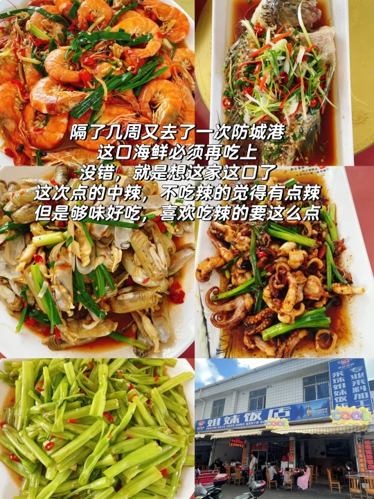 周末防城港海边游吃海鲜还是比较推荐的 我这次去就是去吃海鲜的 海边和其他玩的地方没有去 白天太阳也很晒很热 一定一定要做好防晒 如果觉得去企沙海鲜市场比较远 可以选择市内的市场买 然后在旁边的加工店加工就好了 海鲜尽量买活的活的 自己买的海鲜种类丰俭由人 加工费15-20元不等 我们第一顿吃了六七百 第二顿吃了200出头 第三顿吃了260这样 稍微能吃辣的直接中辣更够味更过瘾鞋 海鲜市场:采珠市场 市场后面一排加工店的头头那家:姐妹饭店
