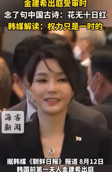 特意说出这句中国古诗,是想表达什么意思?还是想传达给谁听?韩国《朝鲜日报》报道:8月12日,尹锡悦夫人金建希,在庭审结束,即将被逮捕并押入单人牢房前,突然吟颂了一句中国古诗——“花无十日红”!