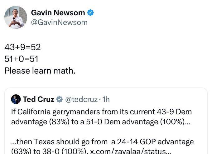 德州共和党参议员克鲁兹发推: 如果加州通过选区划分,将民主党优势从目前的43比9(83%)提升至51比0(100%),那么德州共和党优势应该从24比14(63%)升至38比0(100%)。 加州州长纽森跟帖回复:43+9=52, 51+0=51,学好数学先。