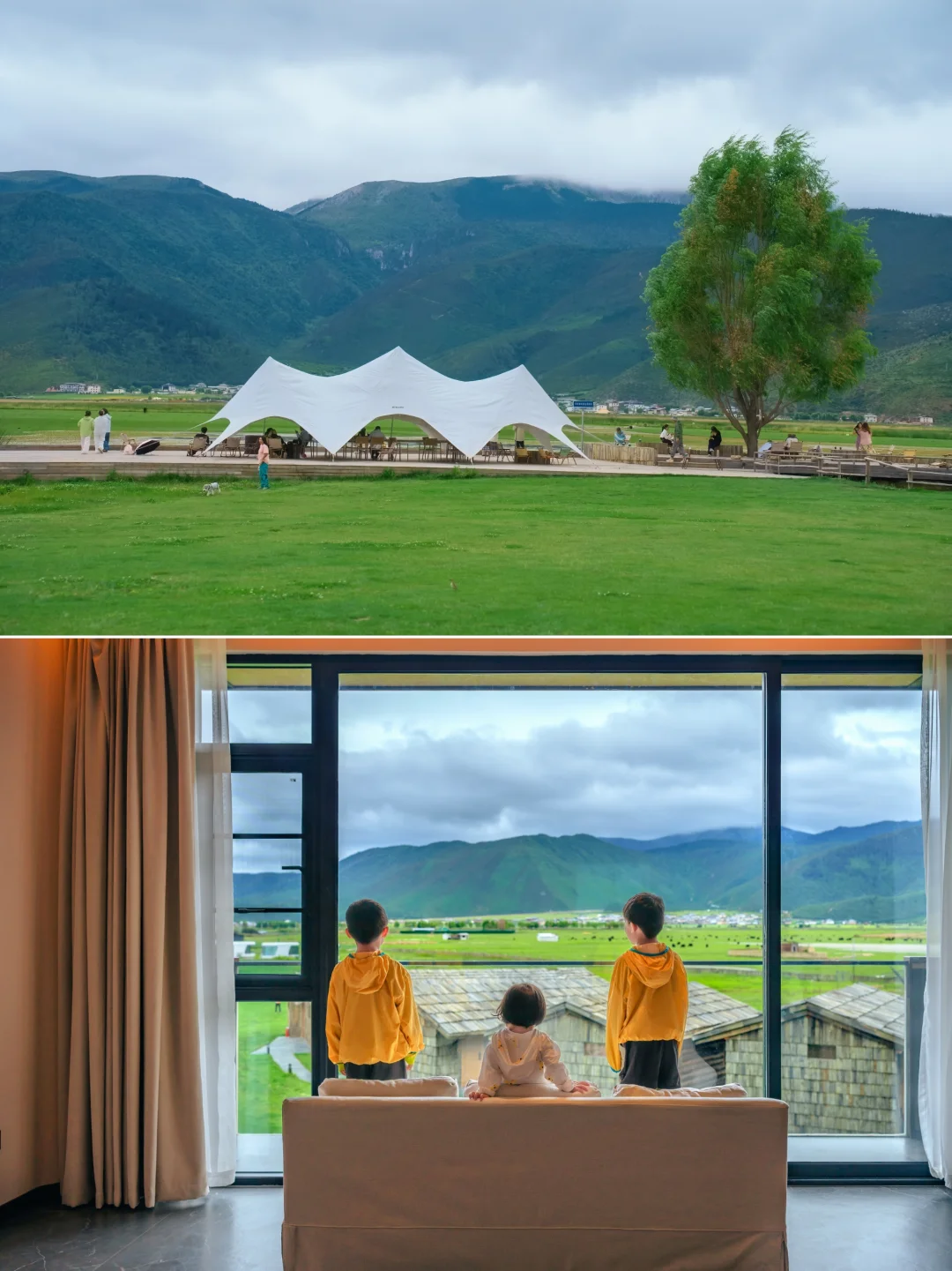 一栋栋童话里的小木屋🏠错落在草甸间,质朴自然。房间的窗户像画框一样,把雪山草原框了进来。夏天满眼绿意🌱,躺着觉得自己好幸福啊。连我6岁的儿子忍不住感慨:当云南人太幸福了!
