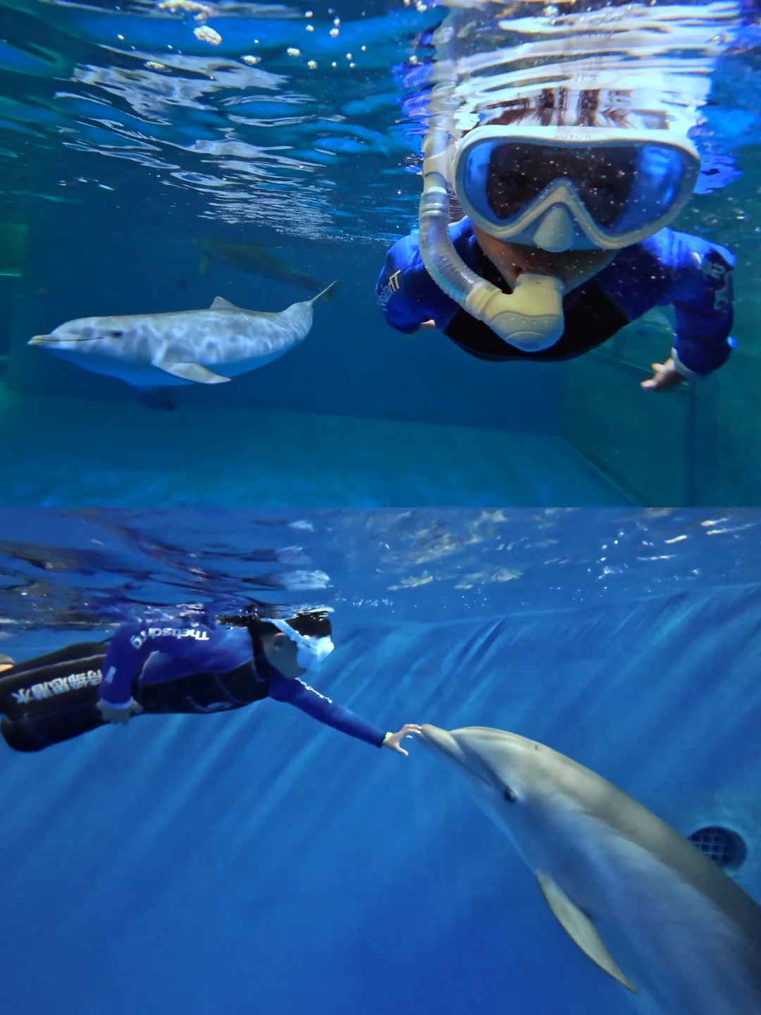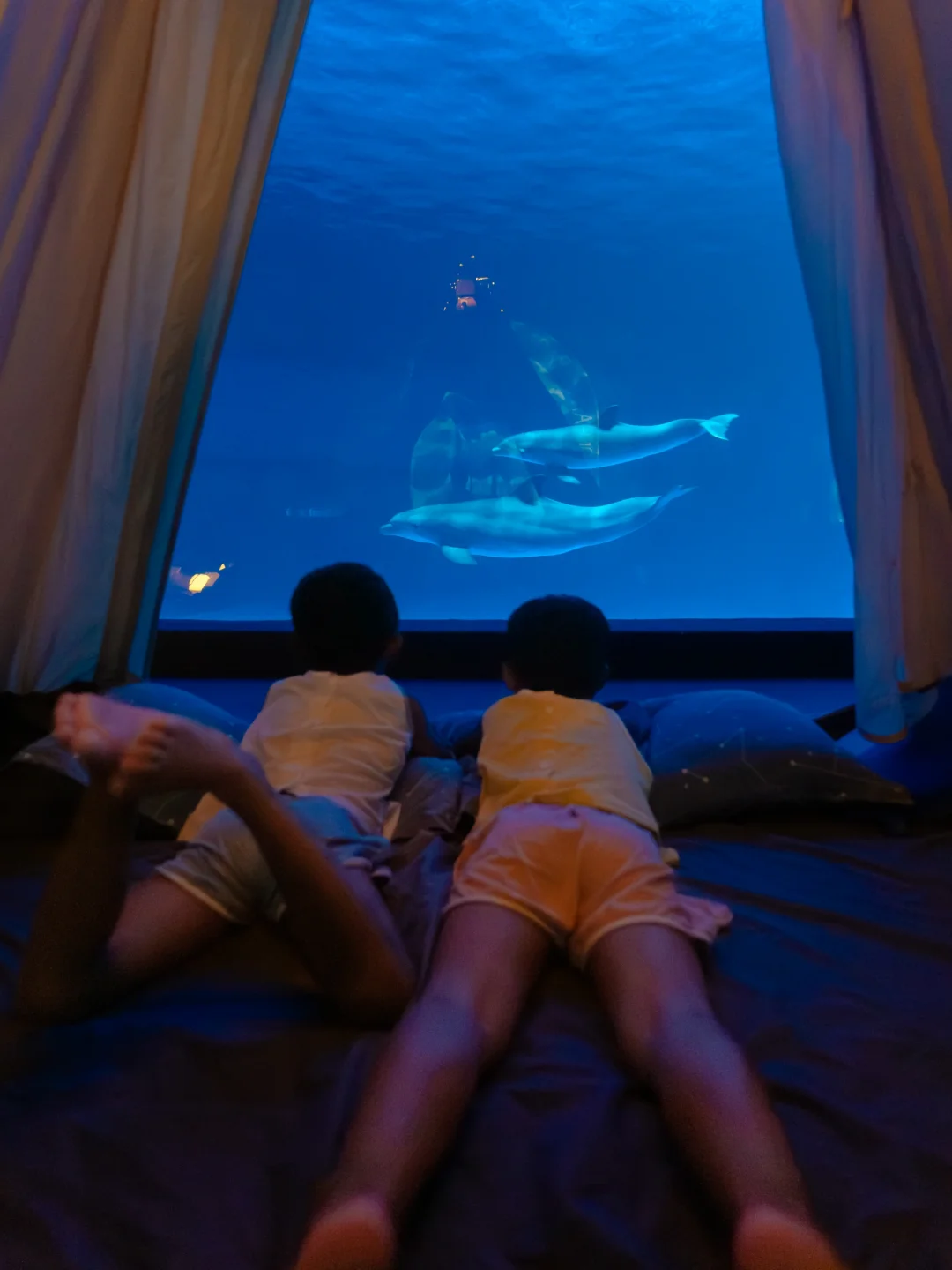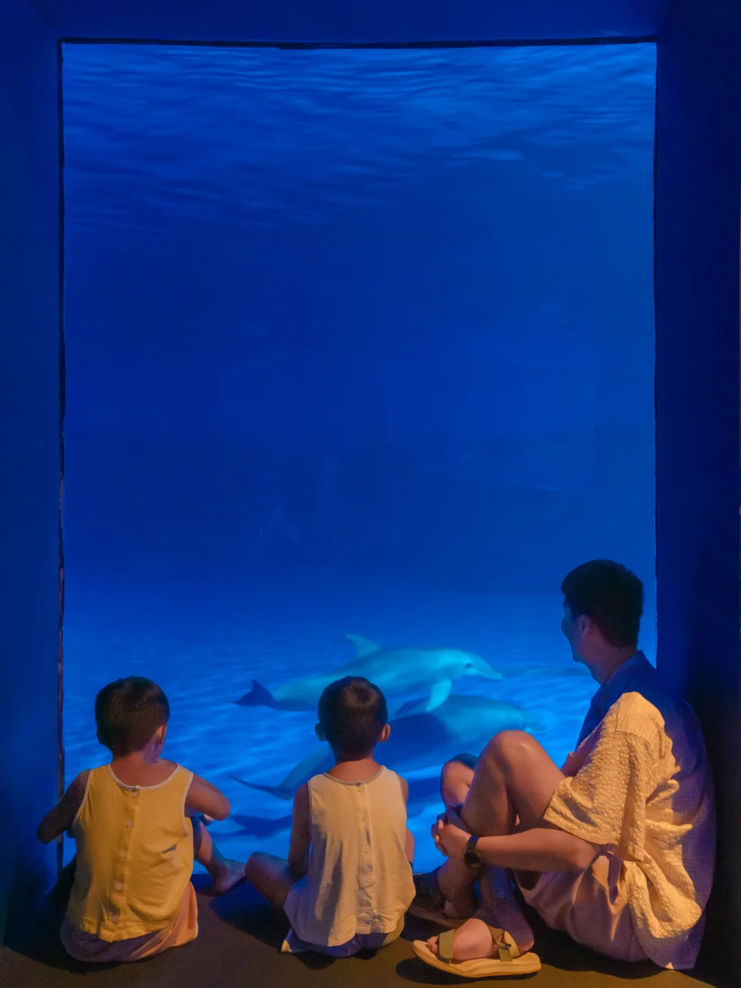 2000多,1大2小夜宿海洋馆,在深海里听着海豚音入睡、和海豚一起游泳🐬,那种宿命感和震撼,我真心觉得太值了~