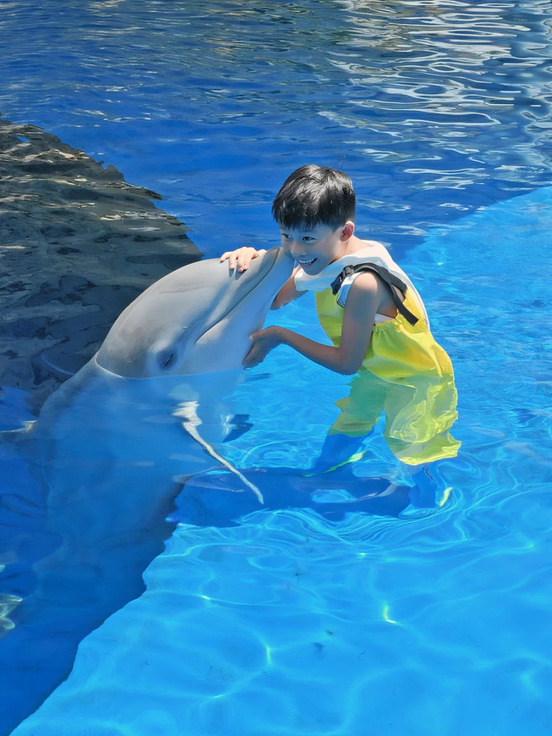 09:40:参加鲸豚救助课程和海豚互动探索,跟着保育员了解鲸豚的救助知识和海豚的科普知识;随后穿戴专业的设备进去浅水区,和海豚半浅式亲密互动,获得结营证书,这个项目非常震撼非常值~