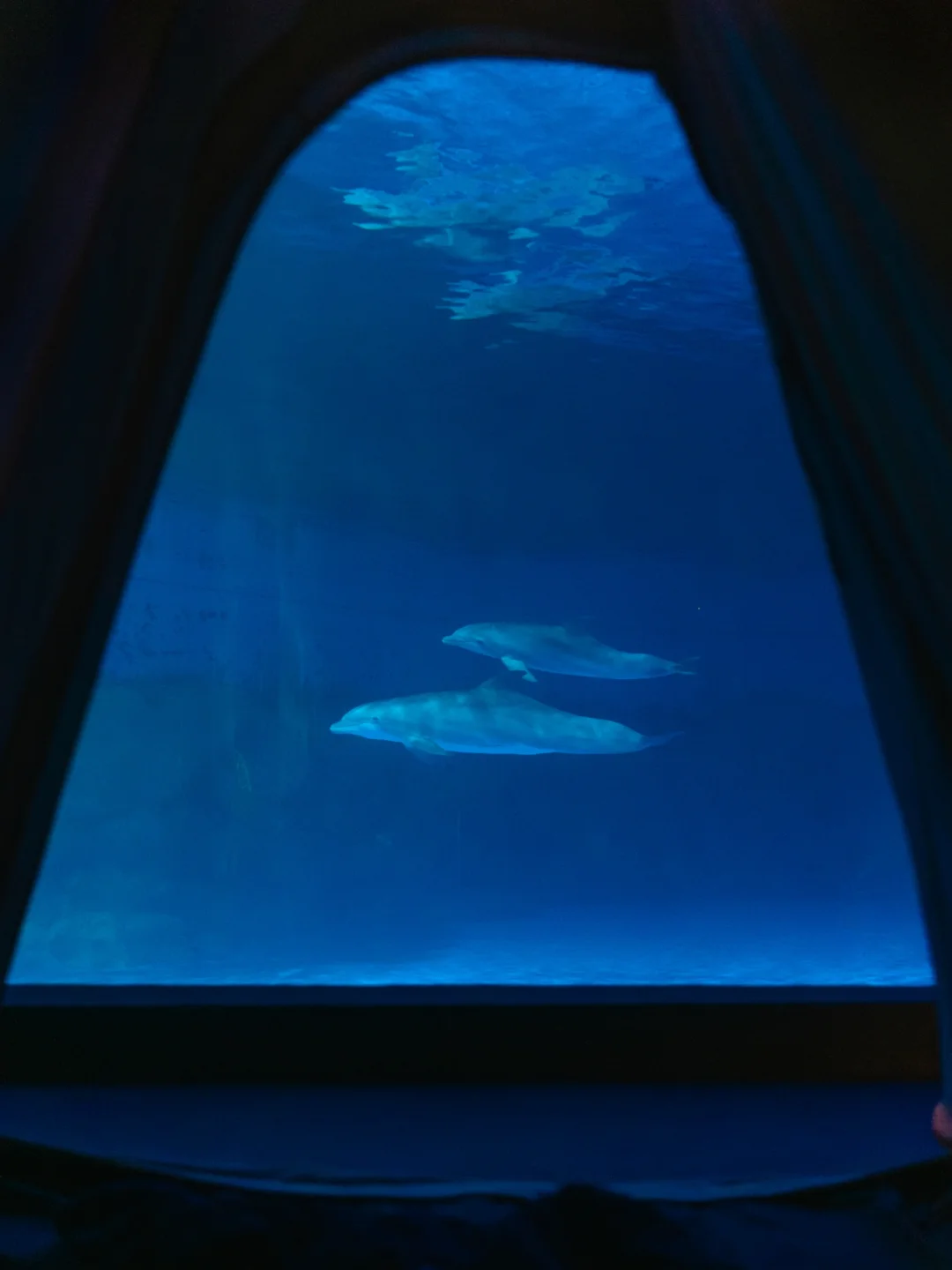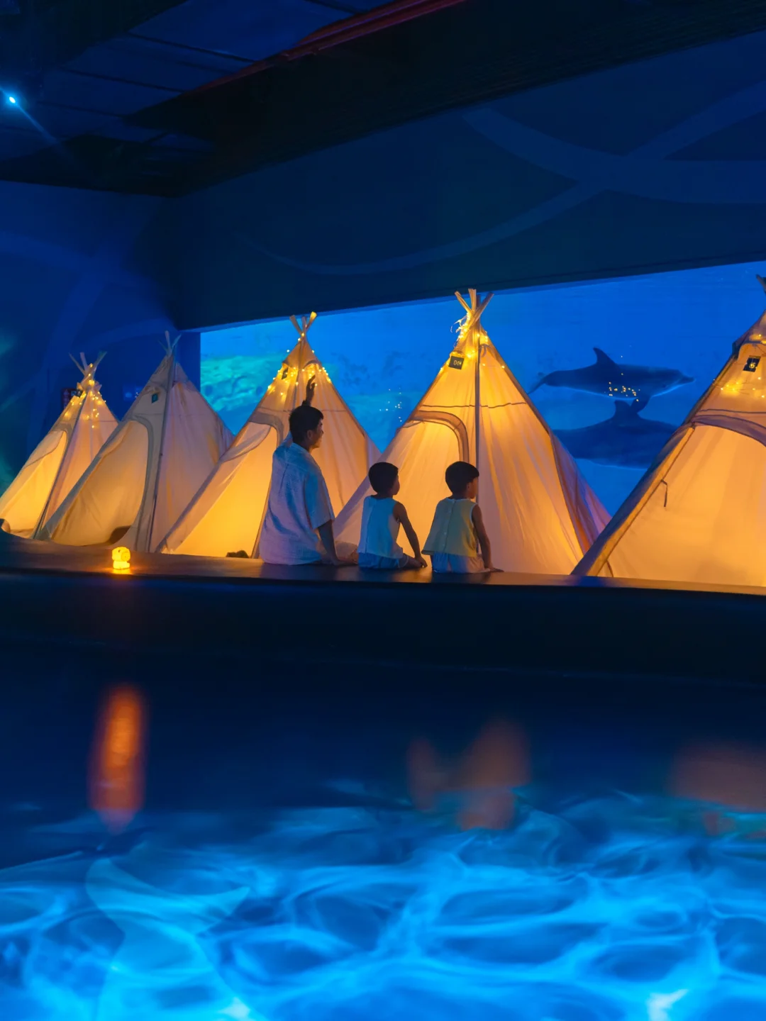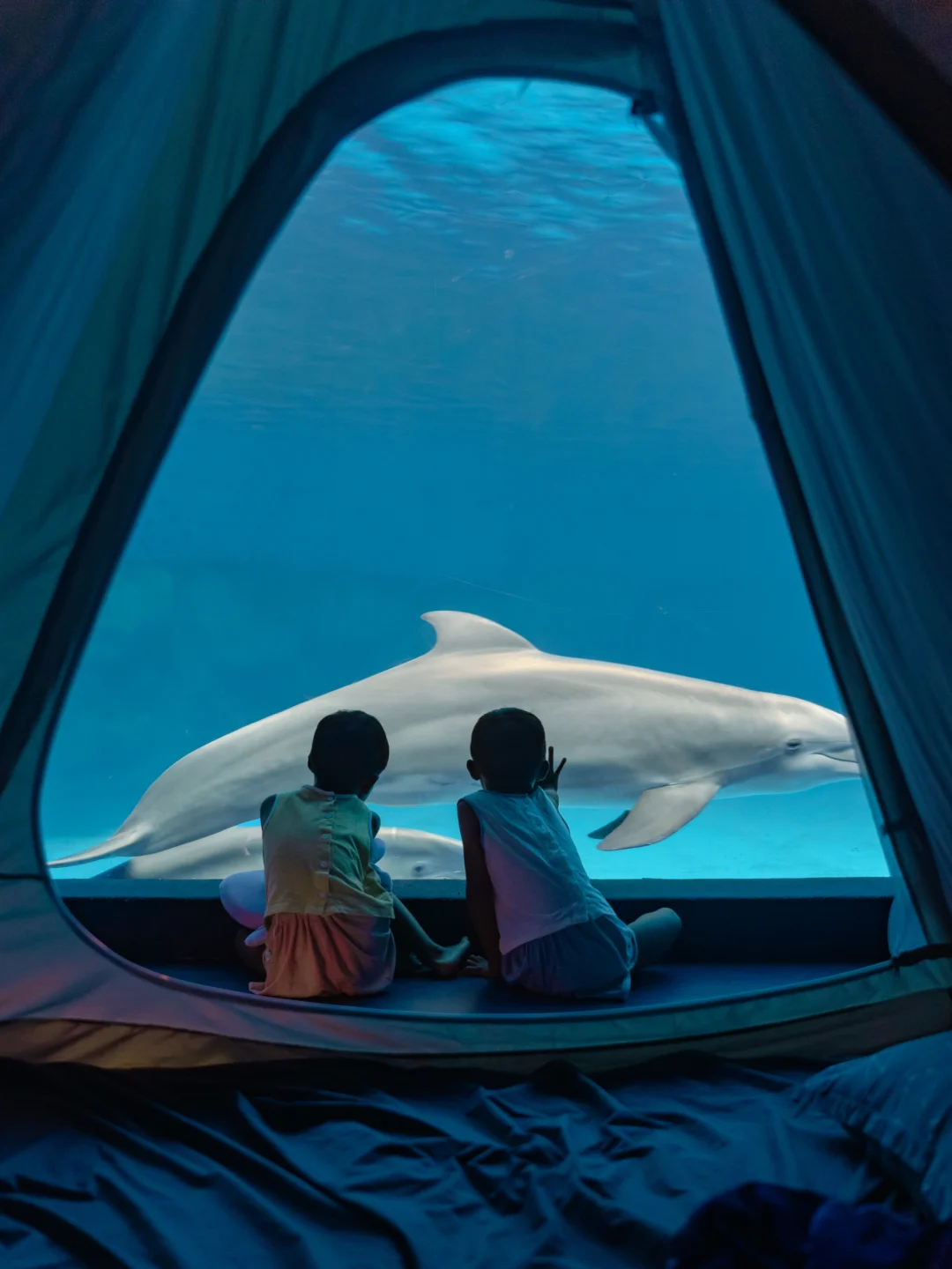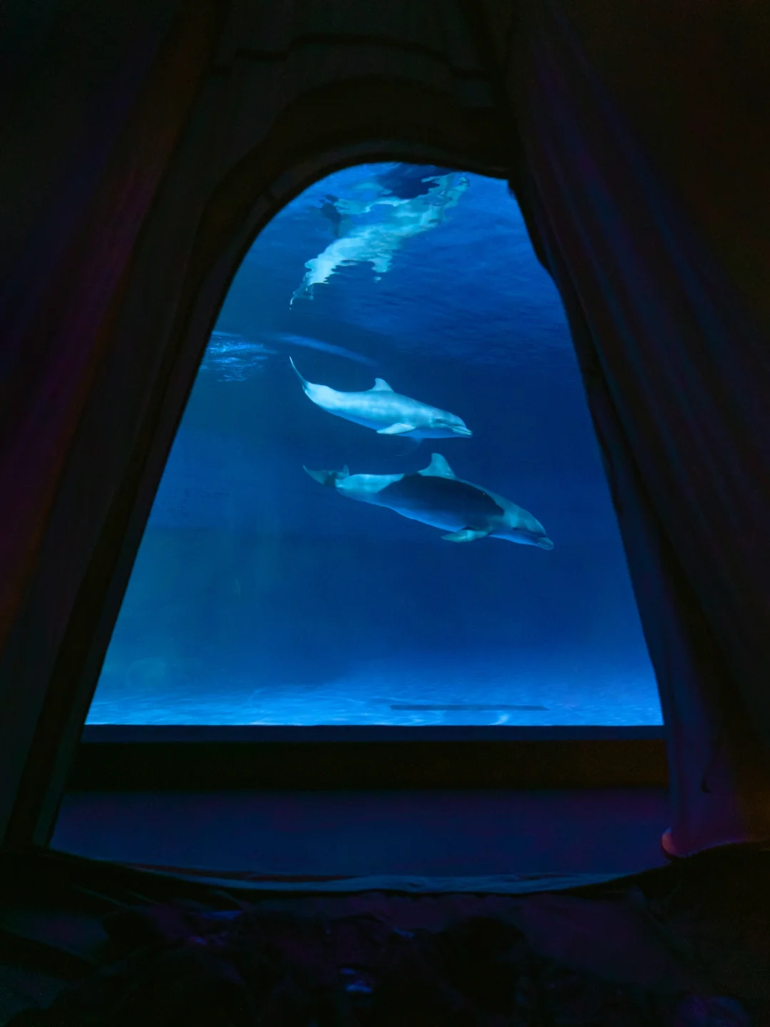 22:00:关灯入睡。帐篷紧贴着巨幕,灯光熄灭后,小海豚灵宝儿和妈妈娜雅化身成优雅的剪影,在幽蓝中无声巡游。它们或疾驰掠过,或悬浮凝视,海豚发出的特殊的高频哨音与咔嗒声,在寂静中清晰可闻。