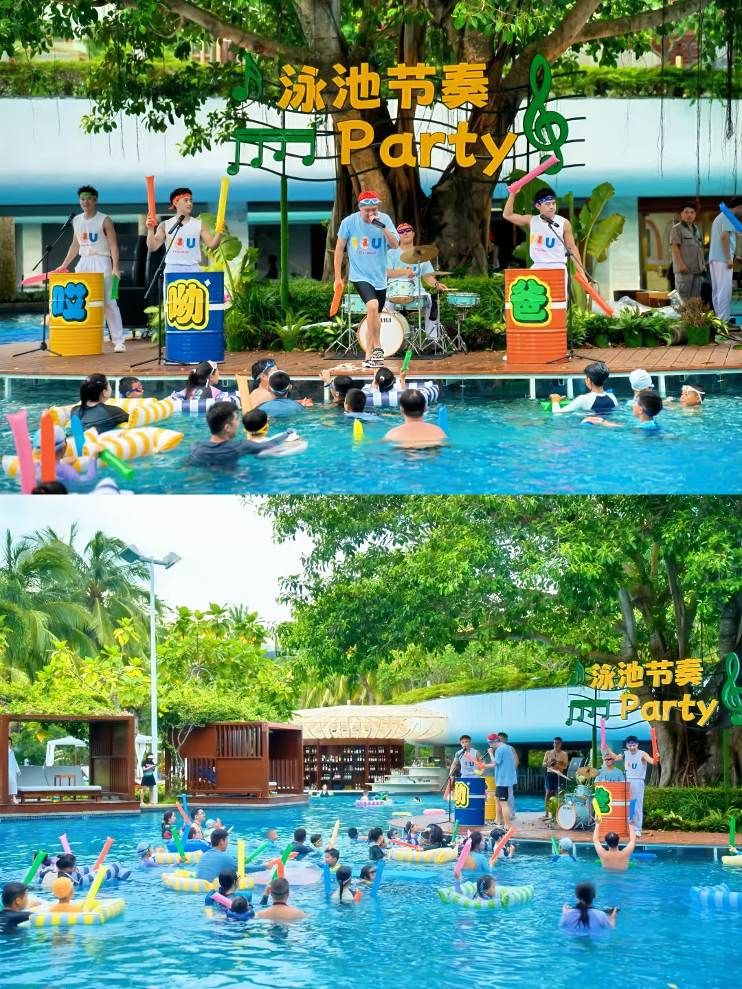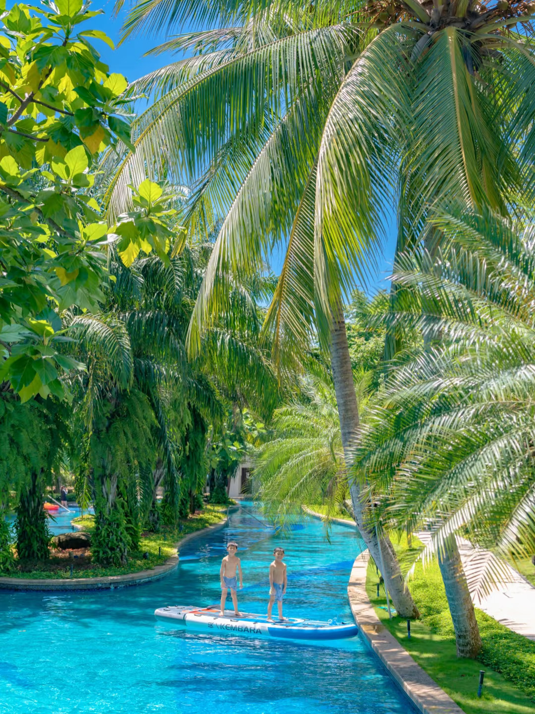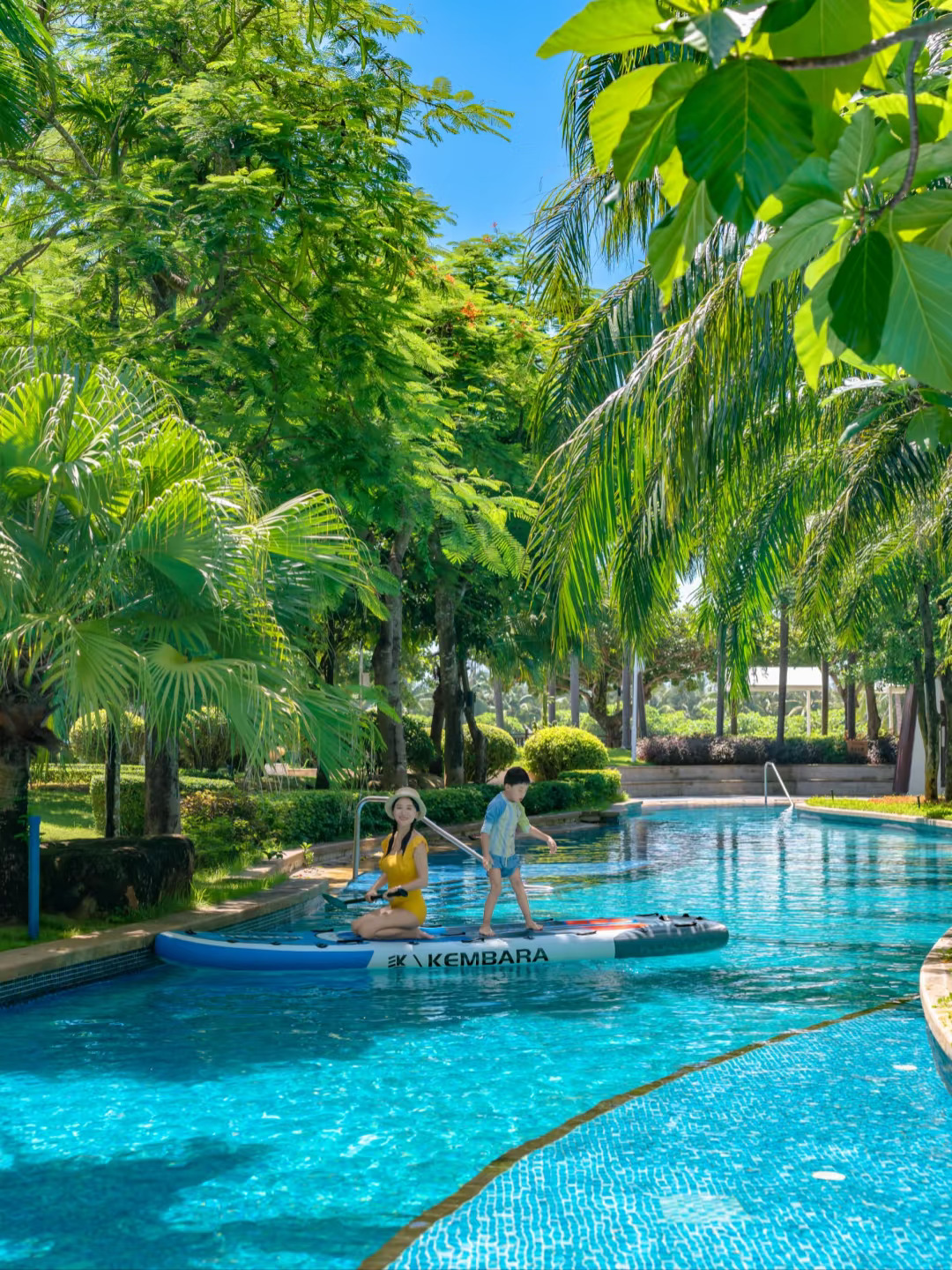 整个酒店公区都是各种各样的泳池,儿童池带滑梯,深水池连通河道泳池,可以在椰林里划桨板,夏日感太强了。今年暑假的每周一三五六还有泳池派对,乐队演唱、泼水大战,真的玩得很开心~