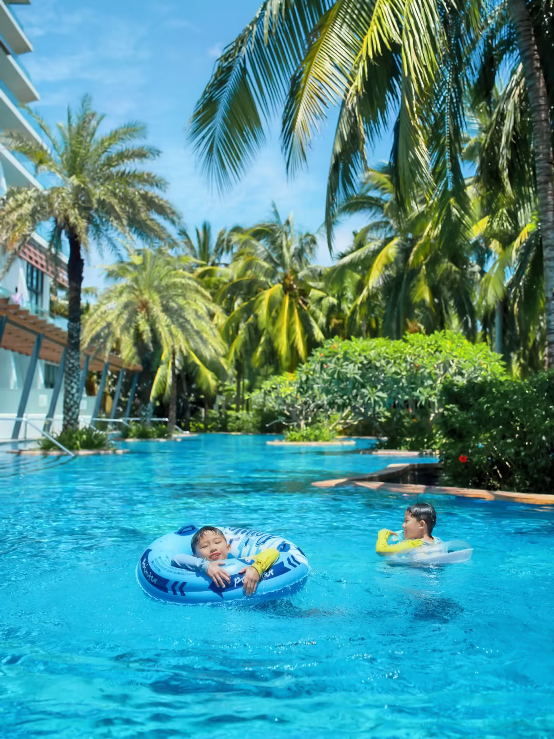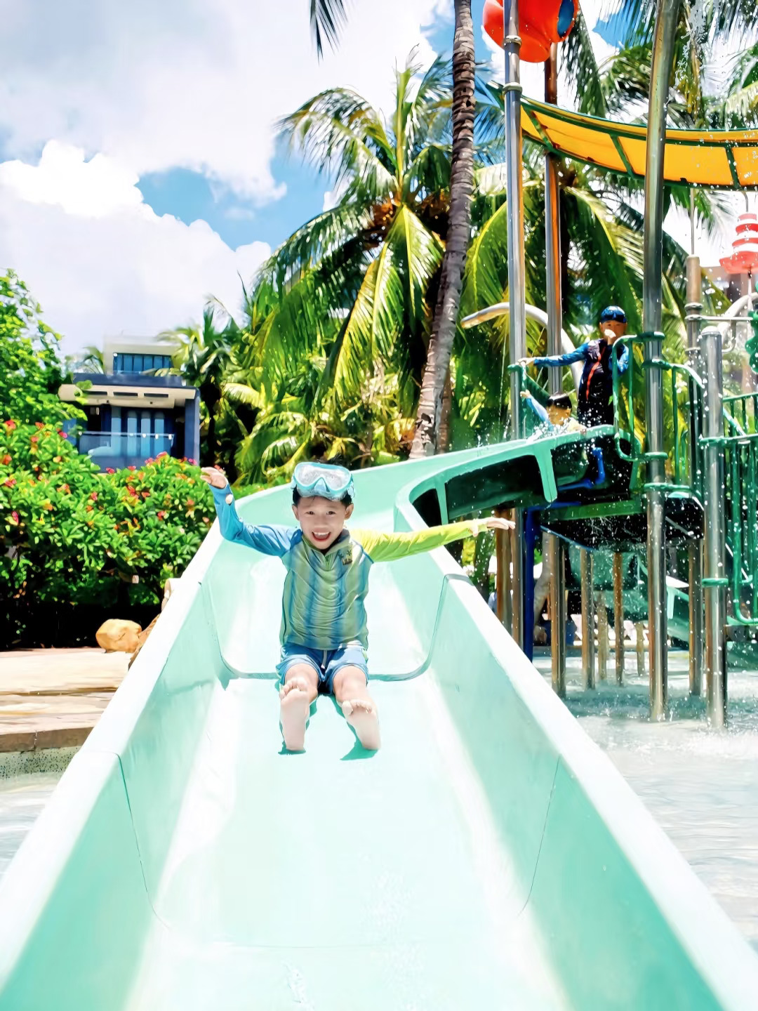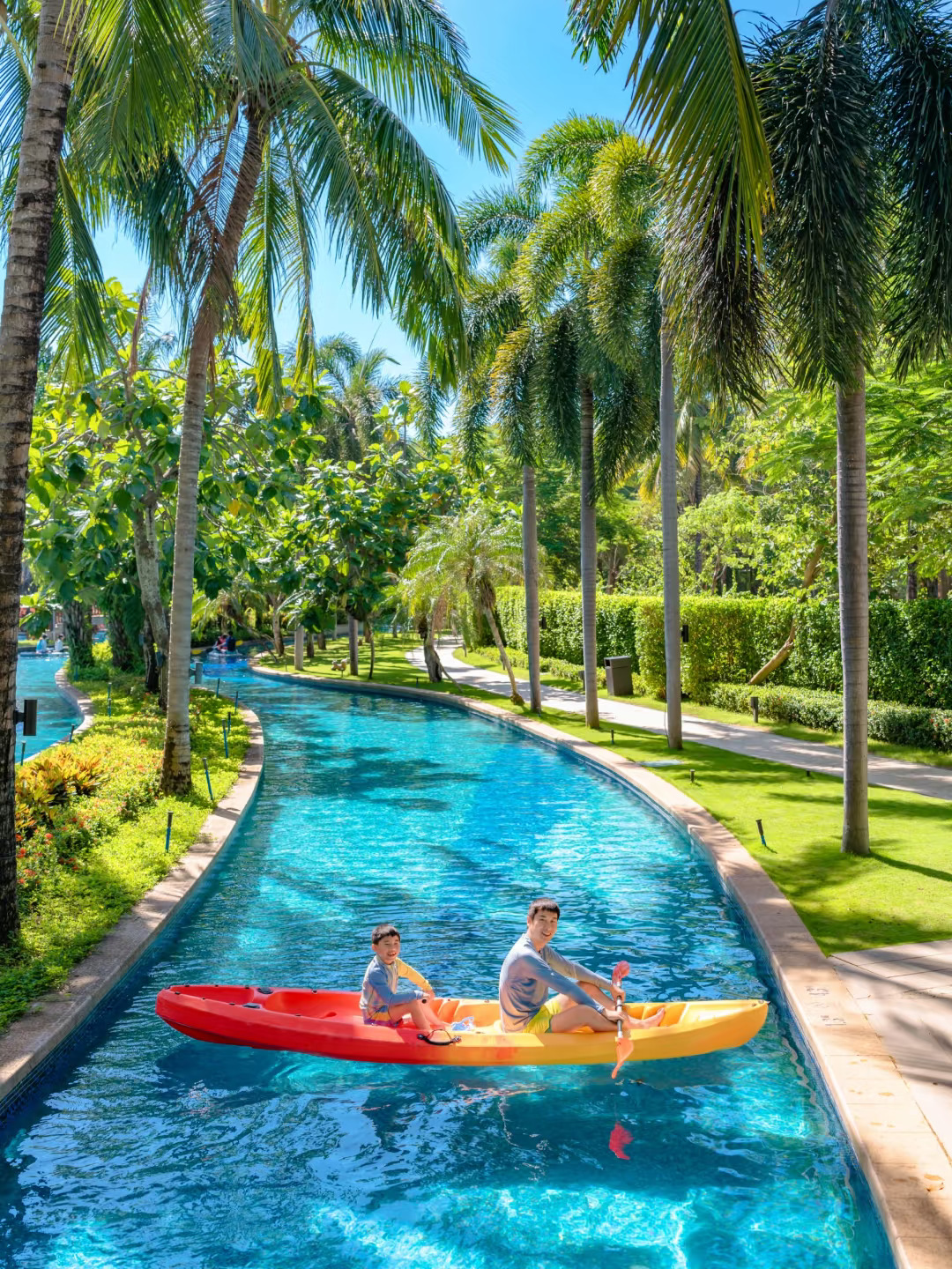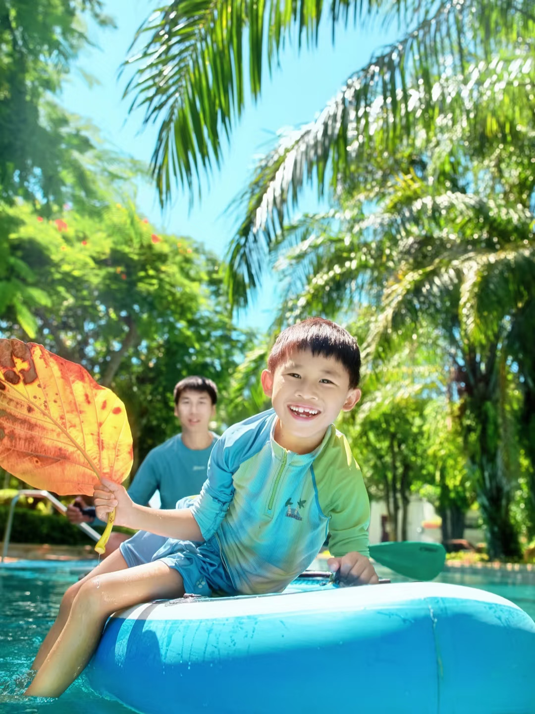 整个酒店公区都是各种各样的泳池,儿童池带滑梯,深水池连通河道泳池,可以在椰林里划桨板,夏日感太强了。今年暑假的每周一三五六还有泳池派对,乐队演唱、泼水大战,真的玩得很开心~