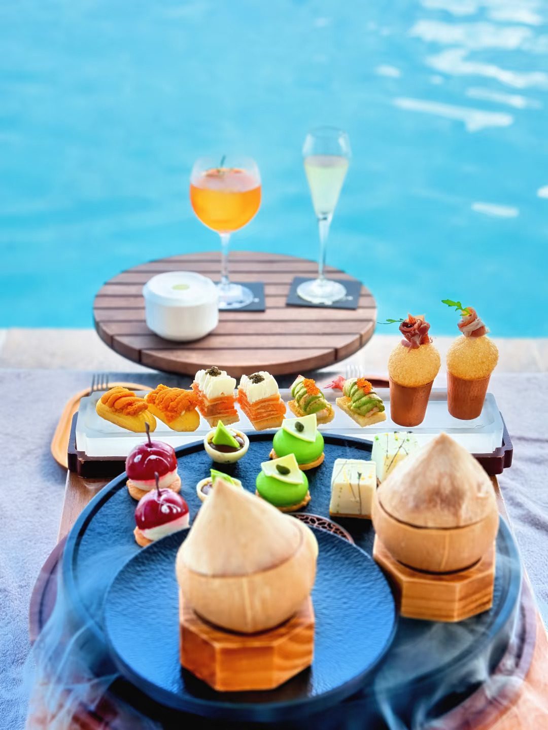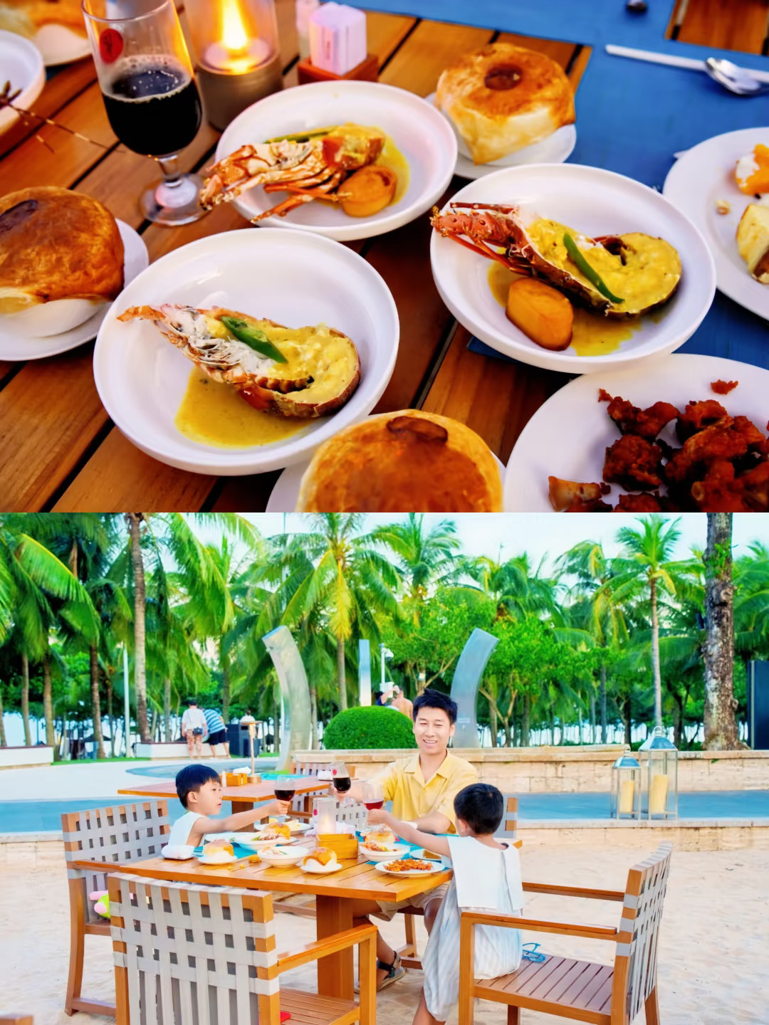 不过我们最喜欢的是水汀沙滩餐厅,这是海边泳池的自助晚餐,有烧烤、海鲜、甜点,还有不定期的火壶飞龙表演,氛围很棒。而且三文鱼、章鱼、虎虾这些都是不限量供应的,海南特色的糟粕醋椰子鸡那些都有~
