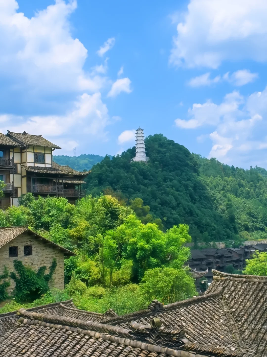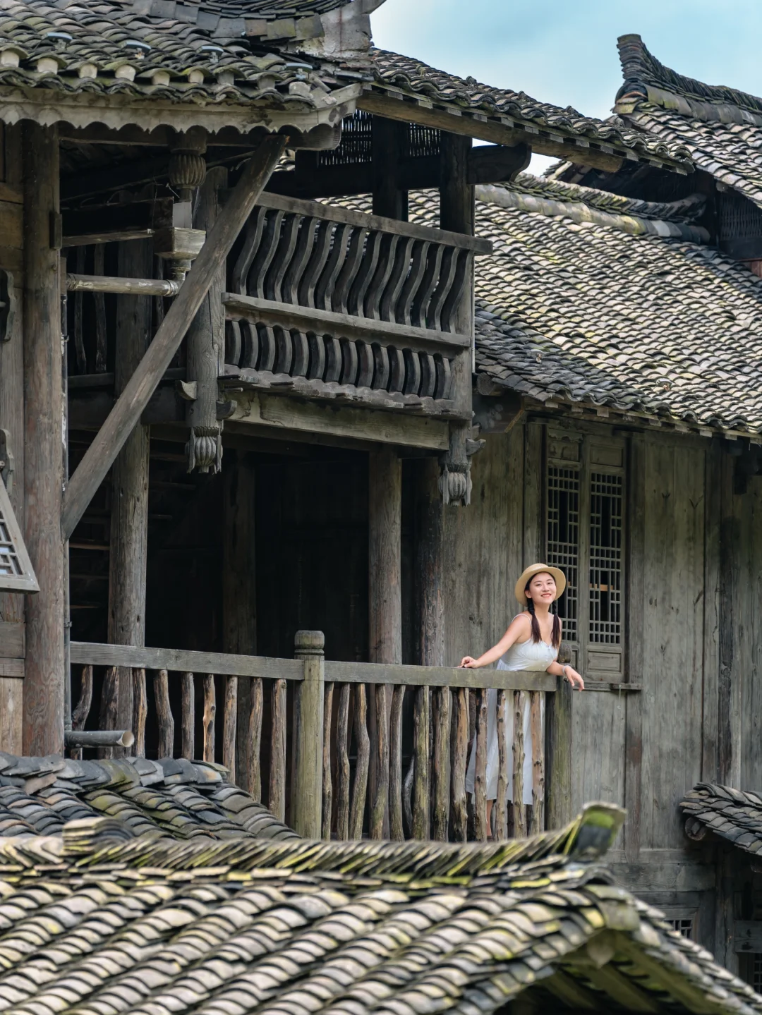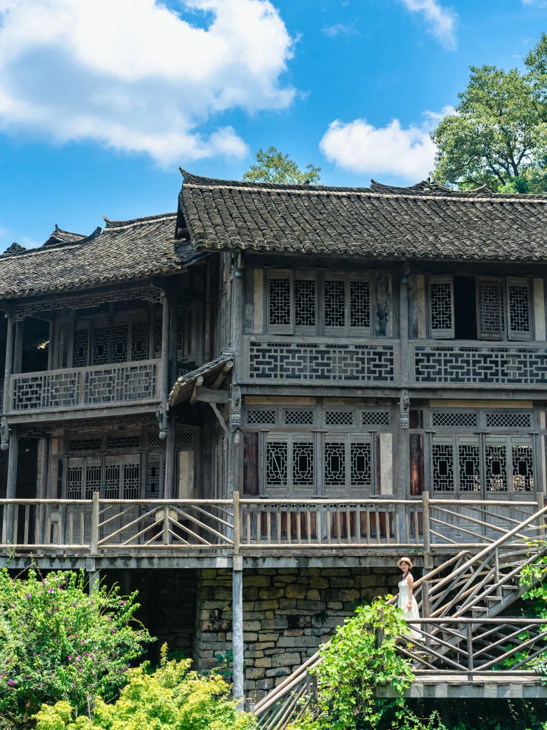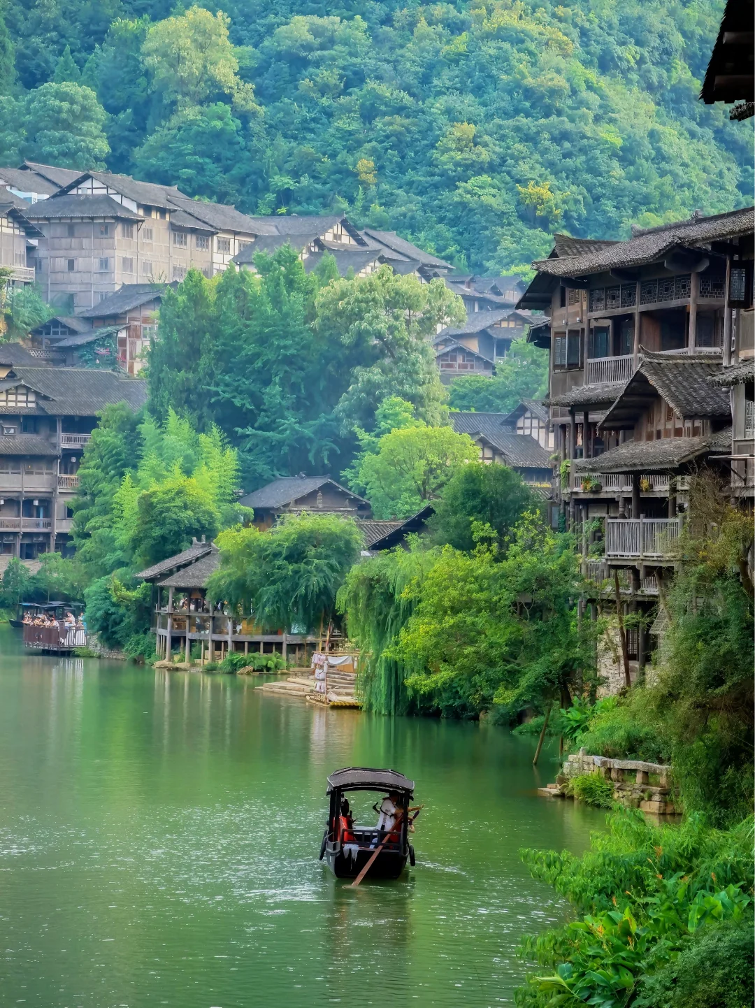 🌿乌江寨建在山水之间,吊脚楼顺着山坡一层层叠上去,前面是清亮的乌江水,后面是绿油油的山,整个寨子就像嵌在画里。
