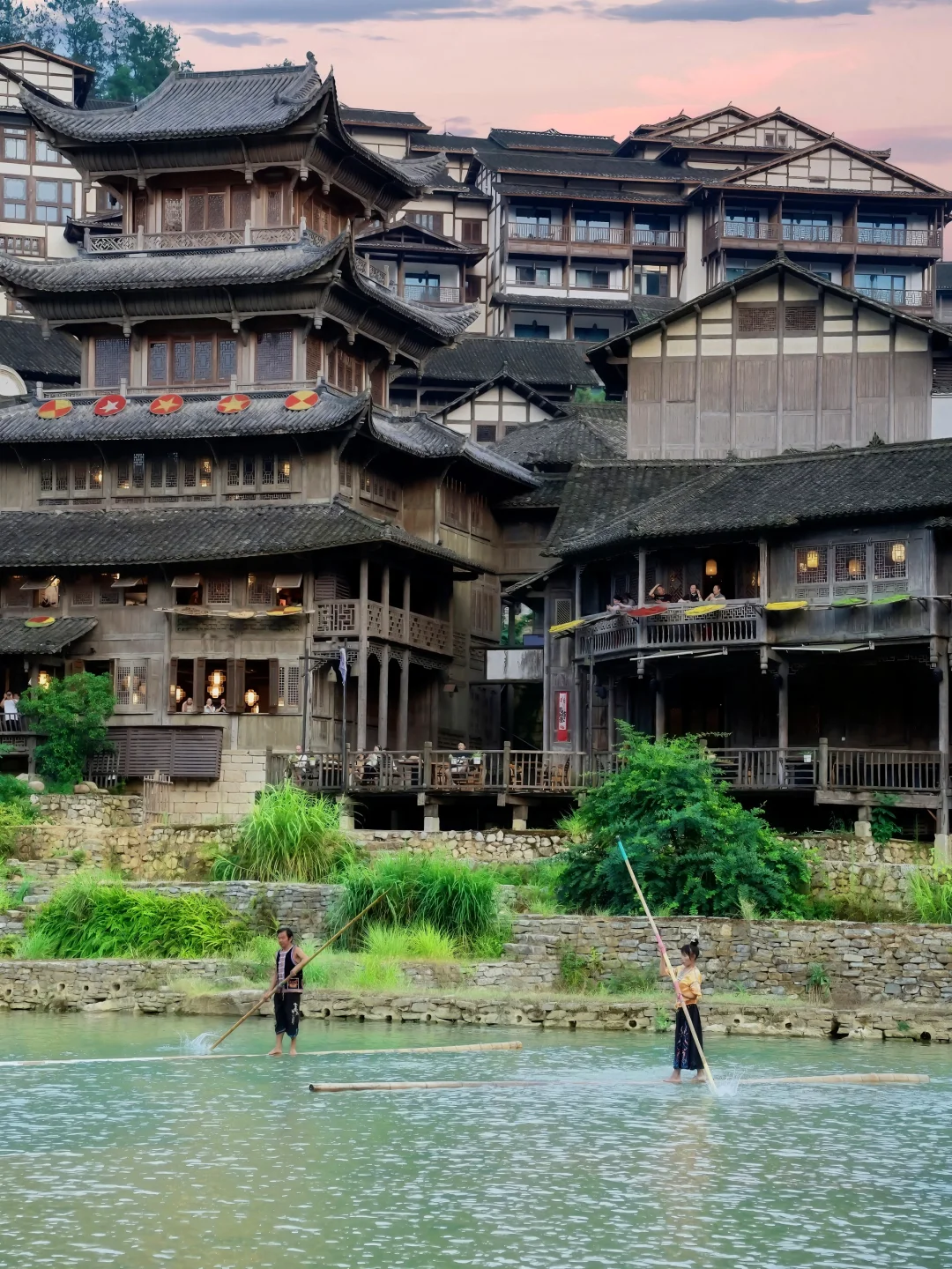 ✅看夜景和表演:晚上的寨子是真漂亮!表演集中在晚上:站在一根竹子上漂的独竹漂很厉害,原生态的号子和民族歌舞也很有气氛。最震撼的是无人机烟花秀!几百架无人机在天上变出星星、鸟、鱼的图案,配合地上的灯光,特别好看。记得提前看景区小程序上的表演时间。