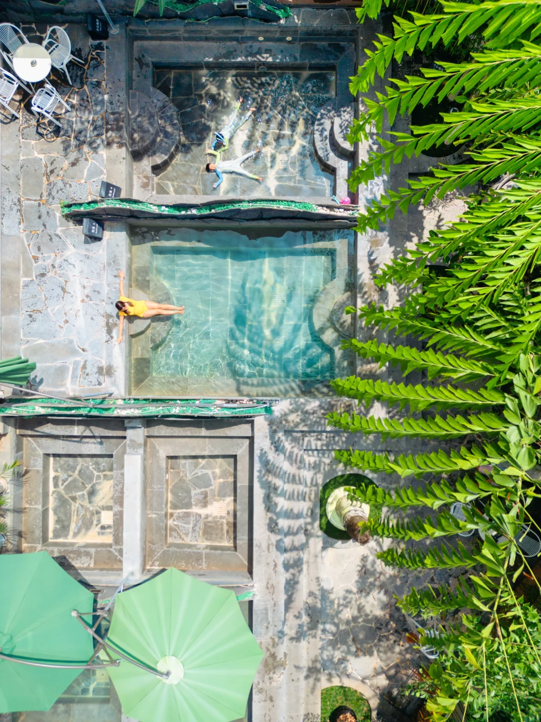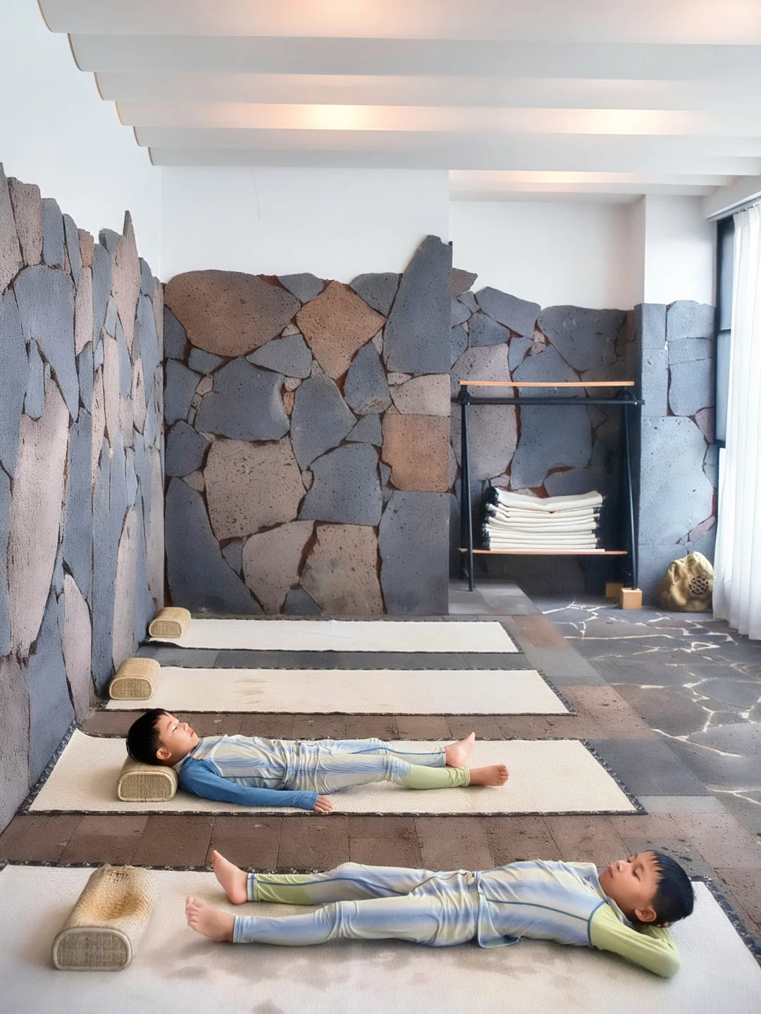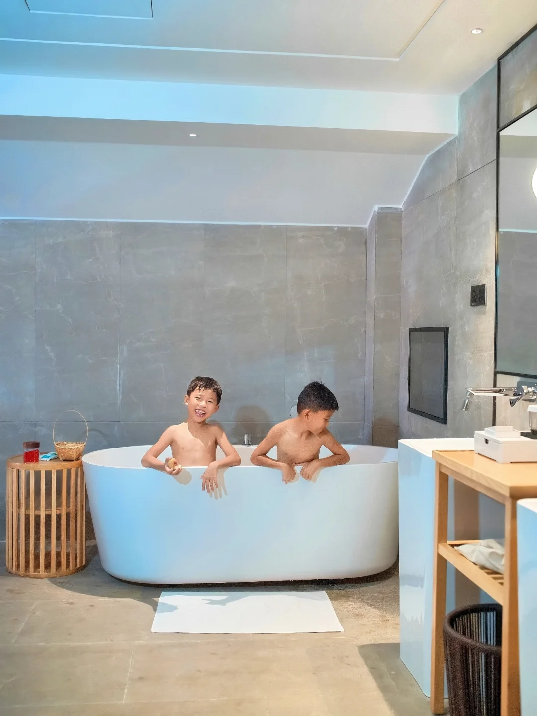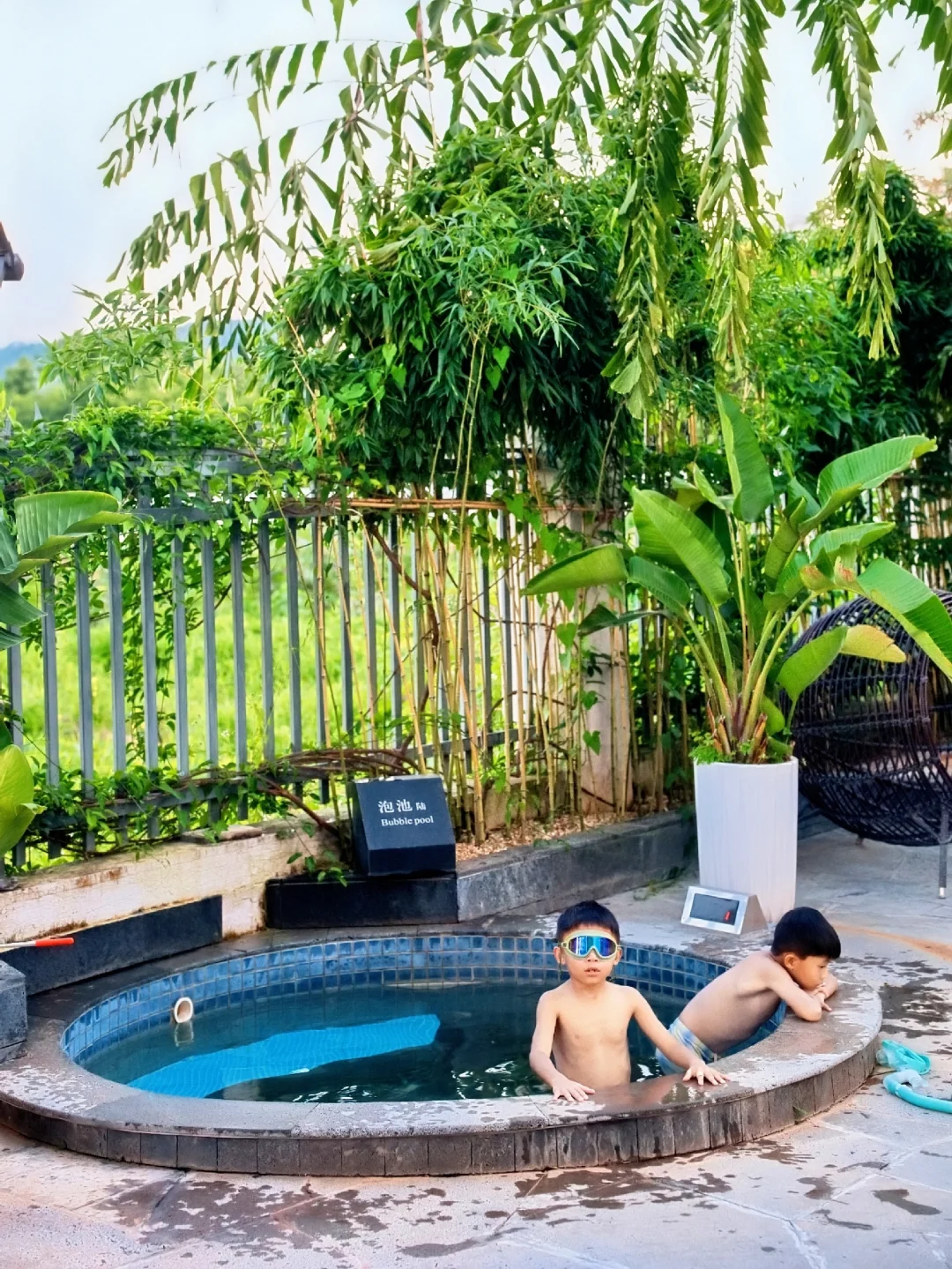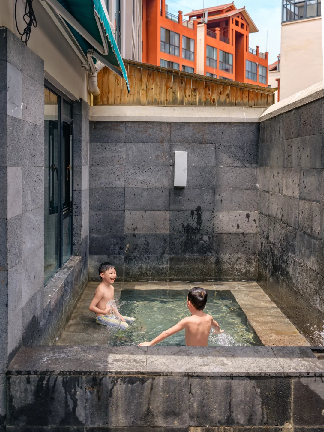 他们家有私汤房,也有公共温泉区。公共池区设计很有意思,大小池子用石头假山巧妙隔开,既有些私密感,又不会完全封闭;还有专门的儿童泡池区,水浅温度低,孩子们在水里扑腾的笑声,听着就让人开心。